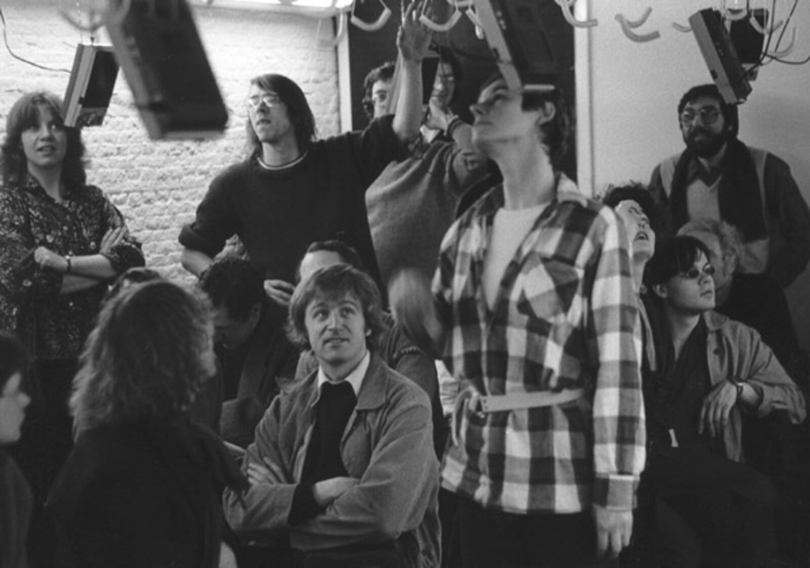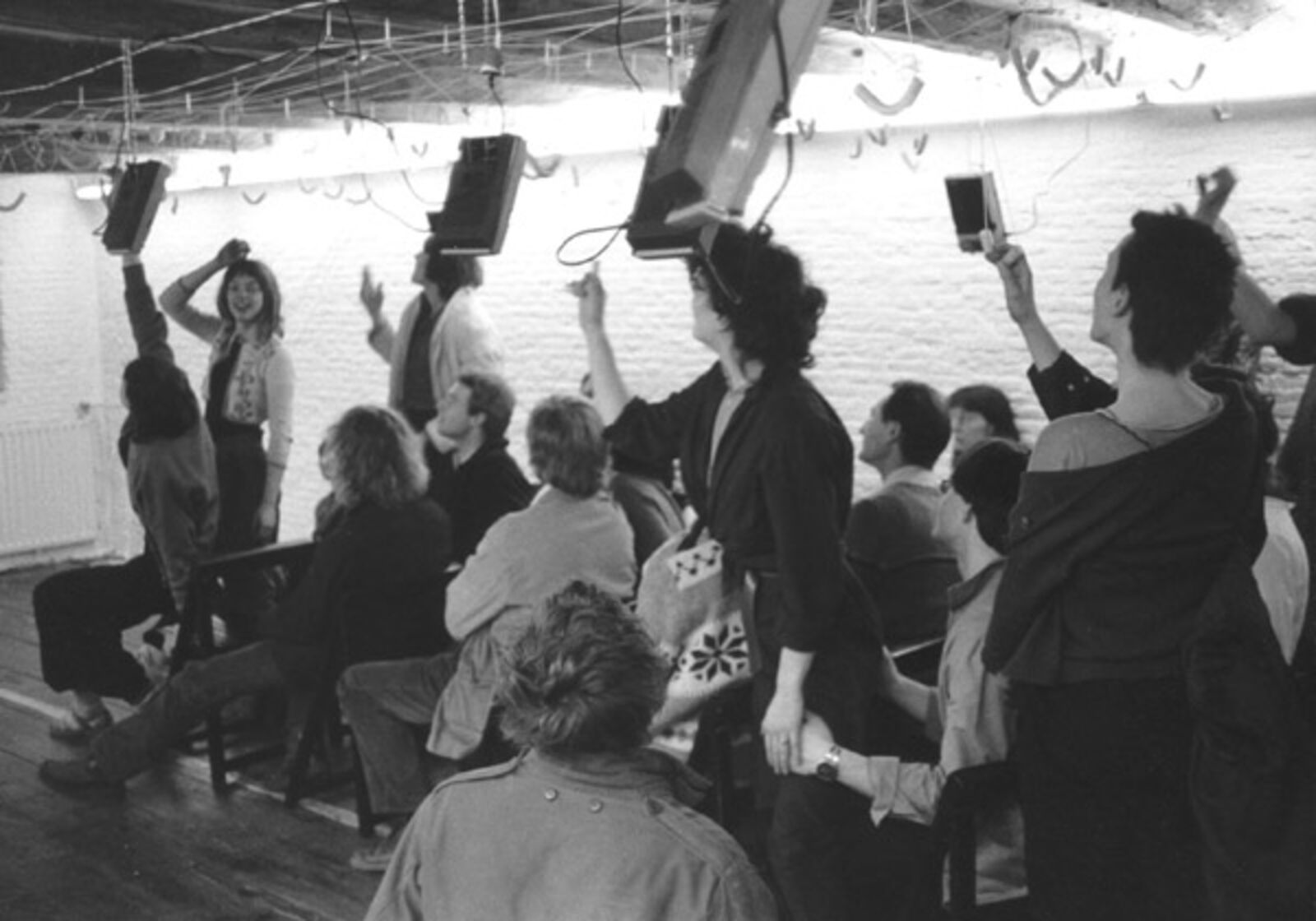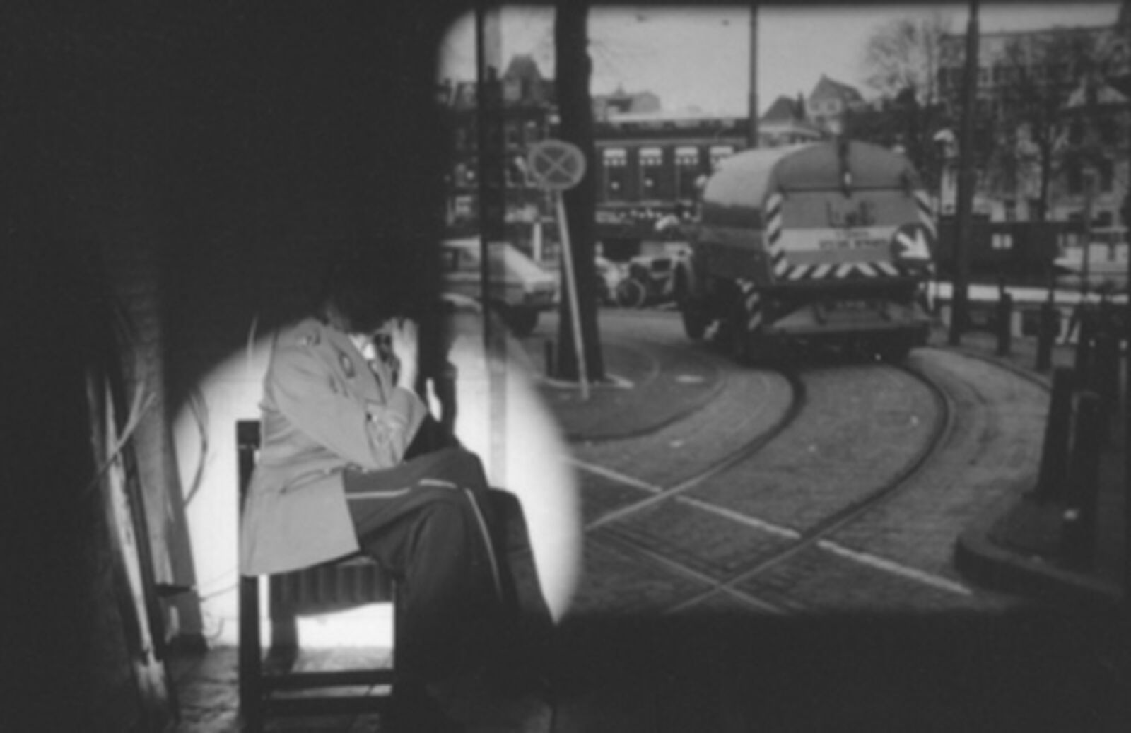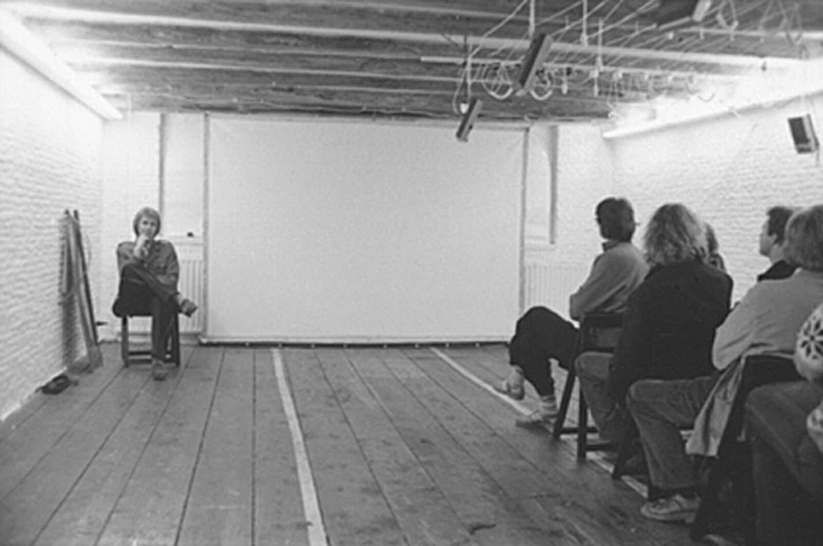 In front of one of the walls a screen was placed on which the film Tinus Horlepiep (1978) was shown. Groeneveld sat to the left in front of the screen and explained the images. The public sat to the right in front of the screen on folding chairs. Above their heads ropes were stretched on which cassette recorders and clamps were hanging. Tram sounds were recorded on the cassettes. So it was as if the public were in a tram. When new tram rails were laid near the artist’s home on the Bakkerstraat, he became fascinated by the rattling and squeaking sounds that trams make. He went on to make sound recordings of the trams on Rembrandt Square and the line that runs past the Tropenmuseum. He also constructed a stringed instrument on which he could imitate these sounds. It consisted of a metal plate stretched along a stick and a bow made of bamboo, cork, tape and wire.