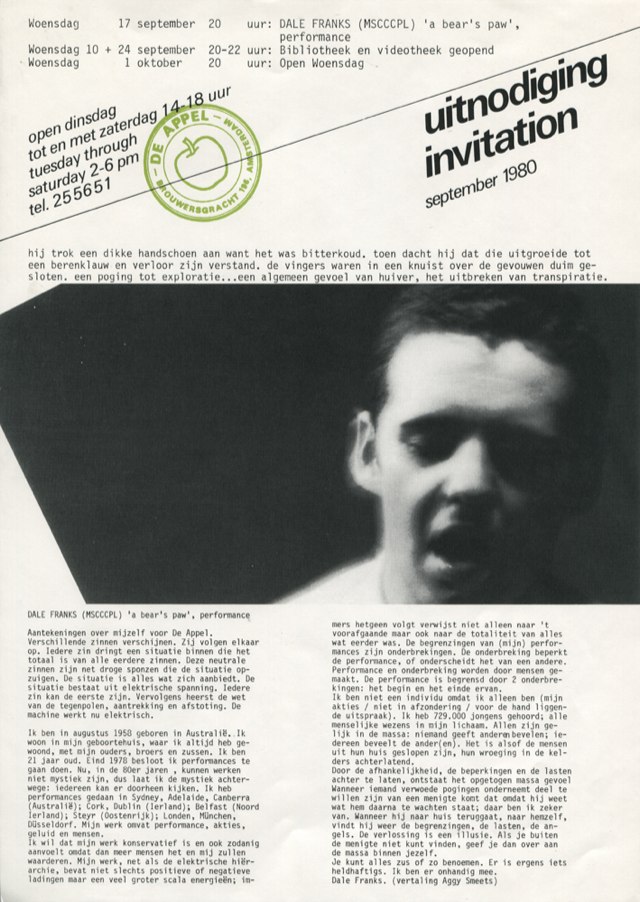 ‘He put on a thick glove because it was bitterly cold. He then had the impression that the glove had grown into a bear’s paw, and he lost his mind. The fingers were closed over the folded thumb in a fist. An attempt at exploration.... A general sense of revulsion, breaking out in a sweat.’ Dale Franks on his performance A bear's paw: ‘Various sentences appear. They follow each other one by one. Each sentence imposes a situation that is the sum total of all the previous sentences. These neutral sentences are like dry sponges that absorb the situation. The situation consists of electric tension. Each sentence might be a first sentence. Then the law of opposites dominates, attraction and repulsion. The machine now works by electrical power.’ (Dale Franks, invitation De Appel, September 1980.)