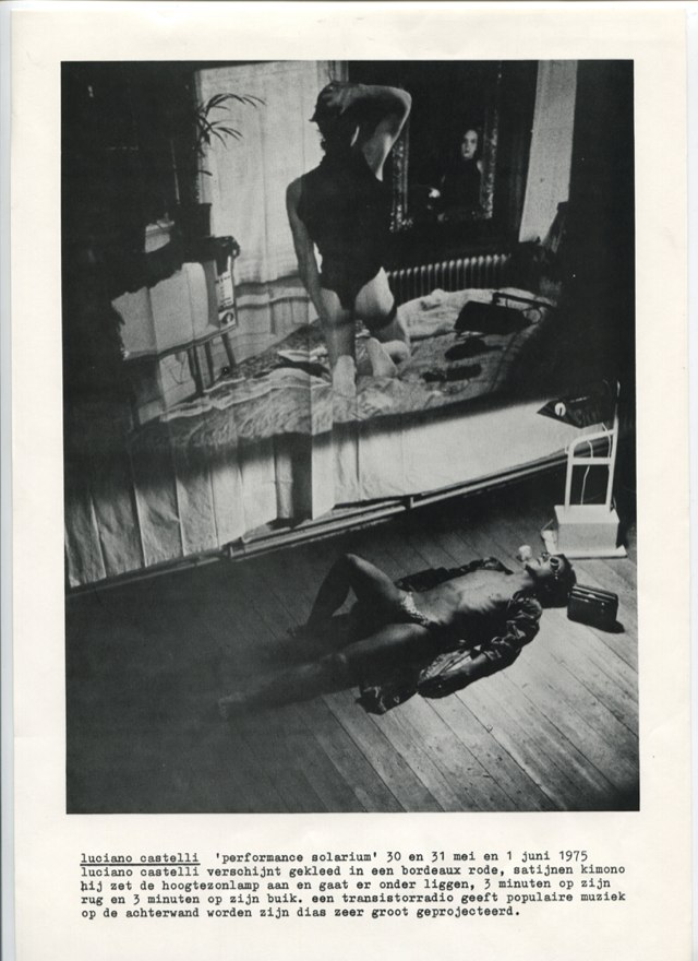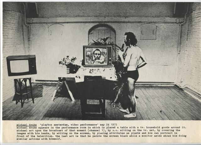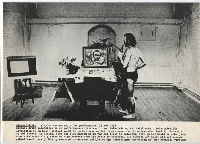 In the performance space a table with a television on it was placed, surrounded by household goods. The artist entered the room and started interacting with the televisionprogramme broadcasted at that moment (on channel 1): by sitting on the TV-set, covering parts of the screen with his hands, writing texts on it and placing objects like a plant or a selfportrait in front of it. As a final act he painted the whole screen black. Afterwards a video of similar actions by the artist was shown.