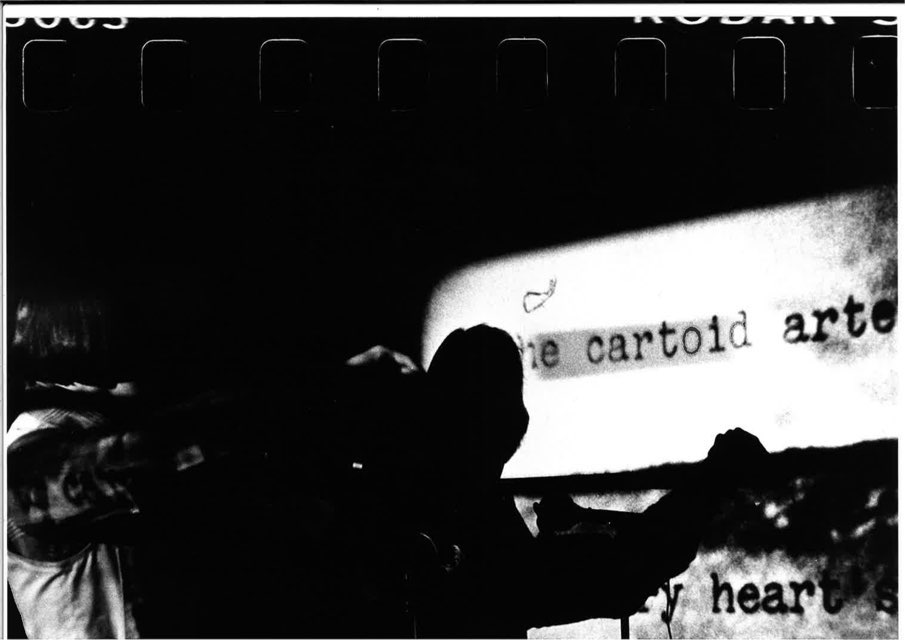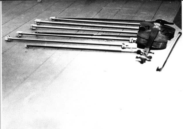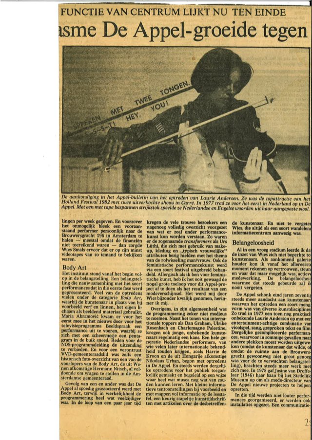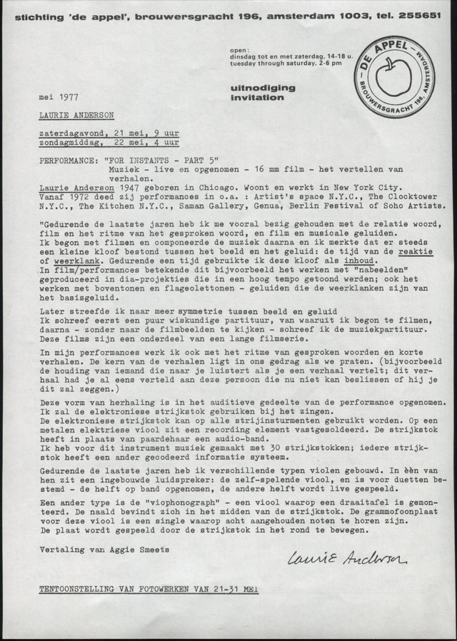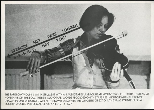 'The performances I do also involve language talking rhythms and short stories. The stories focus on spoken word attitudes (for example, the attitude of someone who is listening to you tell a story, you have told the same story to this person before, and this person cannot decide whether to stop you or not. This sense of repetition is incorporated into the audio sections of the performance. I will be using the electronic cross bow for one series of songs. The electronic cross bow can be used on any bowed instrument. A tape head is soldered to the body of an electronic metal violin. Instead of horsehair the bow has a strip of audio tape [words on the tape are in Dutch when the bow is drawn in one direction; when the bow is drawn in the opposite direction, the same sounds become English words].' (Laurie Anderson, invitation De Appel, May 1977.)