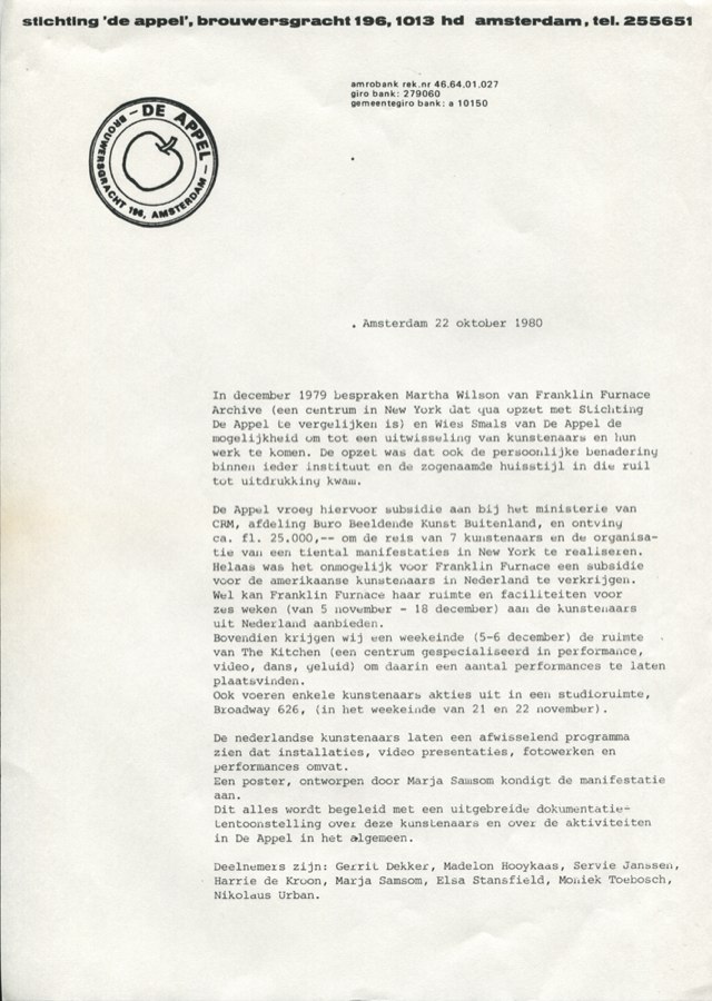 Press release and information sheet concerning Dutch Treat exchange programme at Franklin Furnace Archive New York