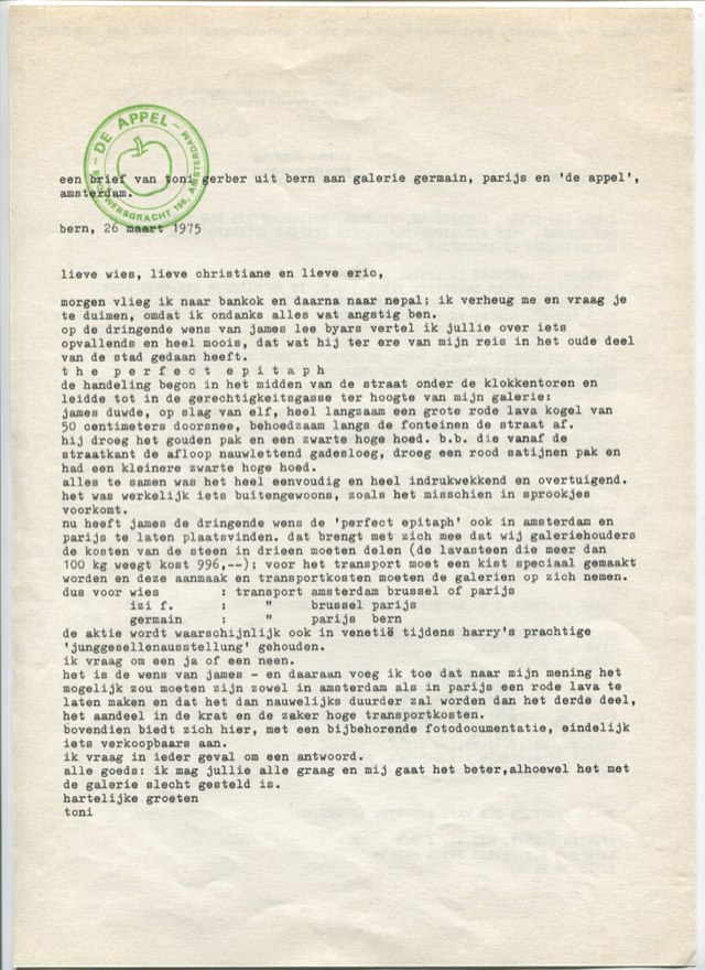 Letter from Toni Gerber, Bern, to Galerie Germain and de Appel