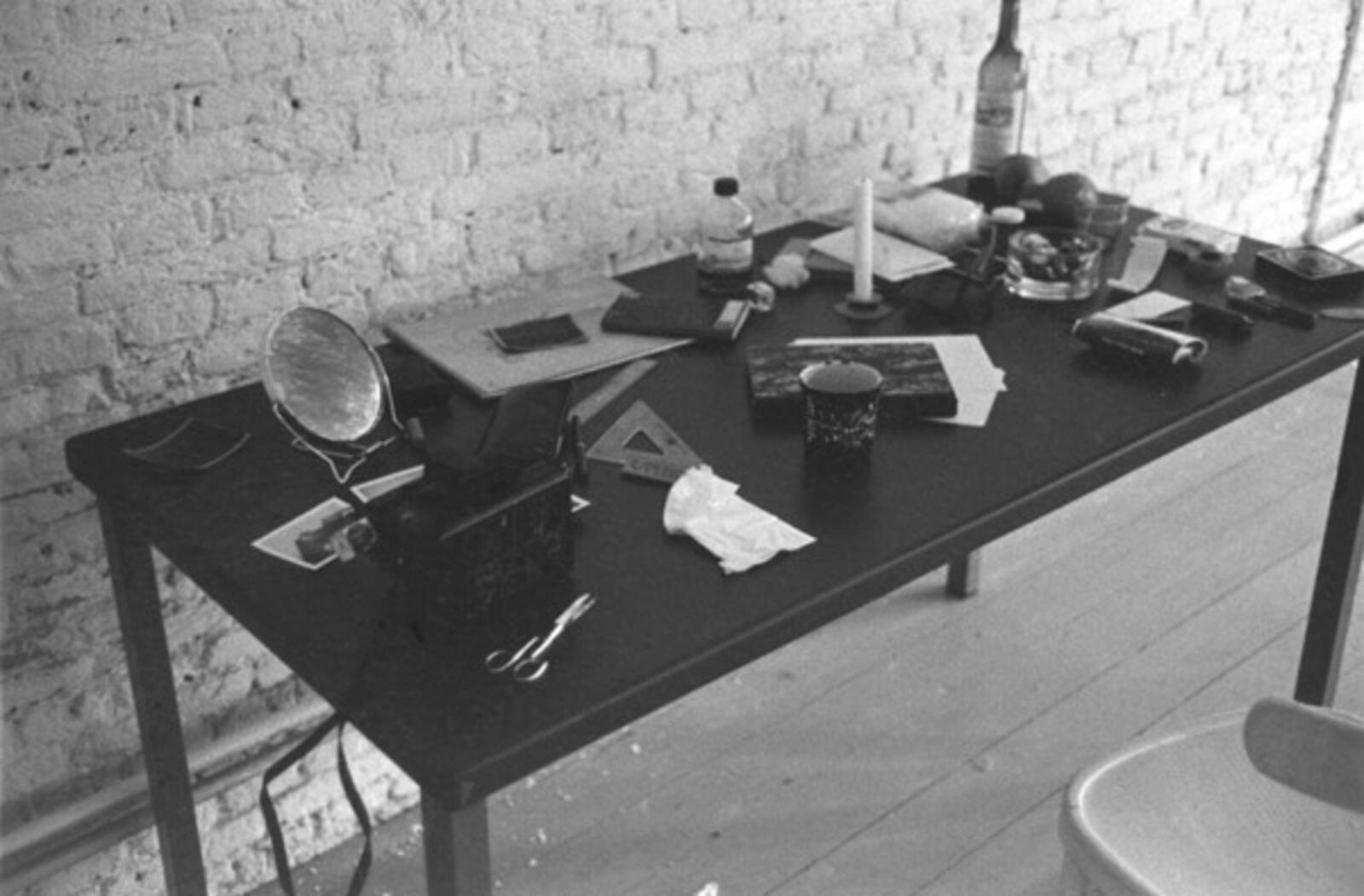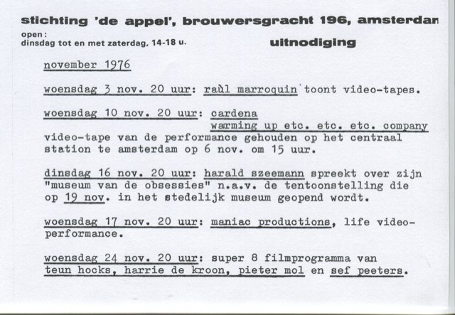 Description of performance: 'My plan is to spend two days and nights prior to Dutch Week living in a corner of the performance space (reading, eating, drinking, sleeping, working, listening, smoking, etc.) with the objects appropriate to those activities (book, bread, plate, cup, chair, mattress, blanket, coffee, wastebin, etc.). I must be gone by the time the Week starts and visitors enter, so that they are faced only with the objects used.' (Sef Peeters, letter to Wies Smals, November 11, 1975, archive De Appel / file Peeters)