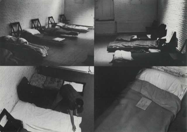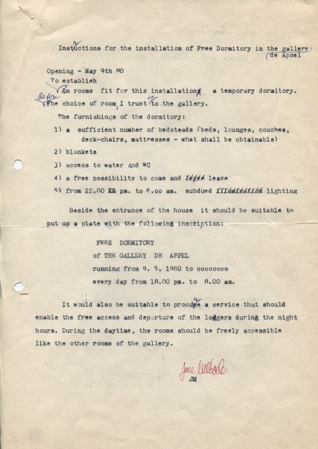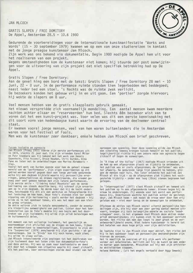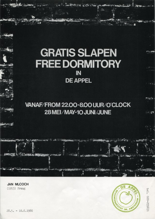 Aan de gevel hing een bord met de tekst: Gratis Slapen / Free Dormitory 28 mei - 10 juni, 22- 8 uur. In de performance ruimte stonden tien legerbedden met beddengoed; naast ieder bed een stoel. ‘s Nachts was de ruimte zwak verlicht. De bezoekers konden het gebouw vrij in en uit gaan. Een ‘portier’ zorgde hiervoor; hij wekte de slapers om 8 uur. Veel mensen hebben van de gratis slaapplaats gebruik gemaakt. Het nieuws verspreidde zich voornamelijk mondeling. Een aantal mensen kwam meerdere nachten achter elkaar en ‘reserveerden' hun bed. Slechts één bezoeker wist van te voren dat het een kunstprojekt was. Voor velen was dit een eerste kennismaking met dit soort vorm van hedendaagse kunst waarin de ervaring van de deelnemer centraal staat. Er kwamen vooral jonge mensen, veel van hen waren buitenlanders die in Amsterdam waren voor het Festival of Fools. Men was de kunstenaar zeer dankbaar; enkele hebben Jan Mlcoch een brief geschreven.’ (Persbericht De Appel, juni 1980.)