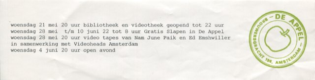 ‘Gedurende de voorbereidingen voor de internationale kunstmanifestatie Works and Words (15- 30 september 1979) kwamen we op een van onze studiereizen in kontakt met de jonge Praagse kunstenaar Jan Mlcoch. Zijn werk was ons bekend via dokumentatie. Begin 1980 nodigde De Appel hem uit voor het realiseren van een projekt. Wegens omstandigheden kon de kunstenaar niet komen; hij stuurde per post aanwijzingen voor de uitvoering van zijn projekt dat niet specifiek betrekking had op De Appel .