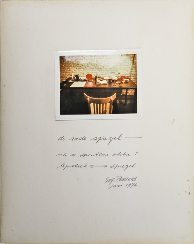 Description of performance: 'My plan is to spend two days and nights prior to Dutch Week living in a corner of the performance space (reading, eating, drinking, sleeping, working, listening, smoking, etc.) with the objects appropriate to those activities (book, bread, plate, cup, chair, mattress, blanket, coffee, wastebin, etc.). I must be gone by the time the Week starts and visitors enter, so that they are faced only with the objects used.' (Sef Peeters, letter to Wies Smals, November 11, 1975, archive De Appel / file Peeters)