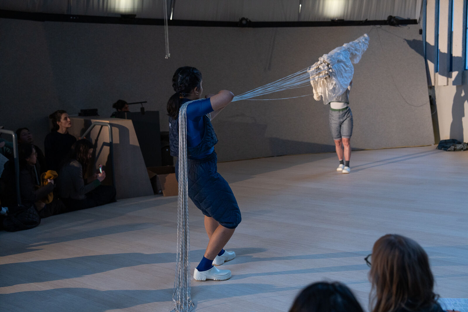 Two performers unfold an object in response to a set of instructions. Embedded within these instructions is the unfolding of a story—the narrative of the artists’ family migration from Palestine to Chile, highlighting its connection to the textile industry, specifically through the creation of a parachute. The parachute was crafted by the artists’ father and brother and sent as a package to her.