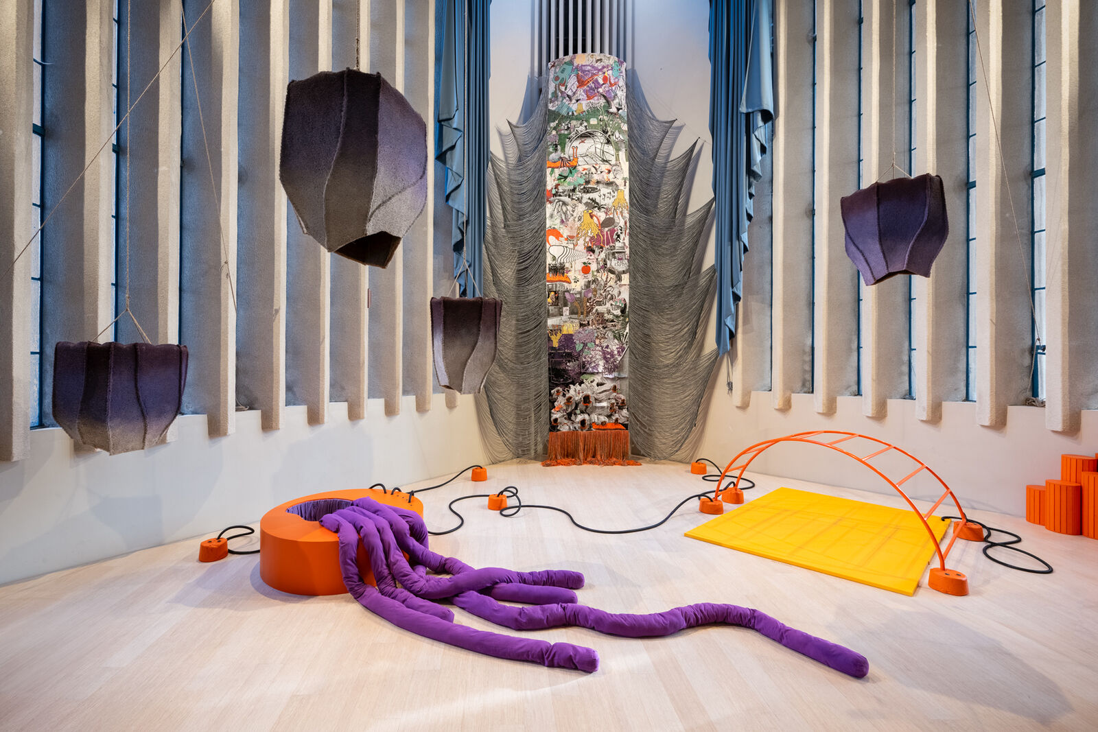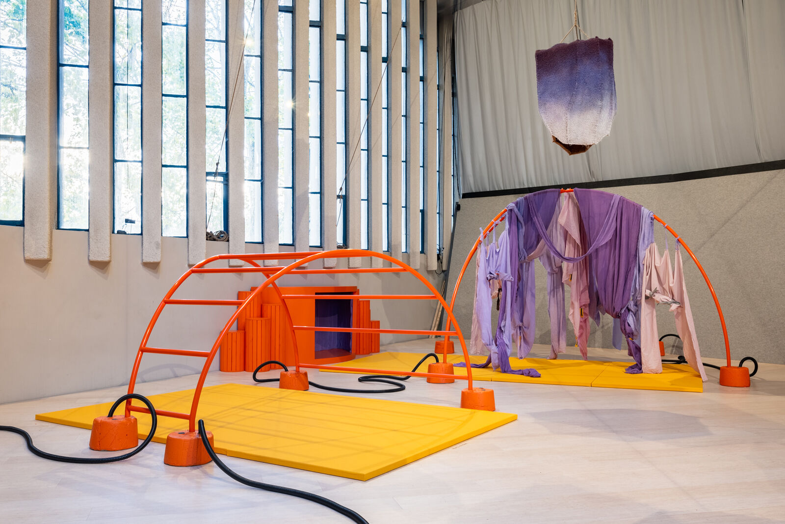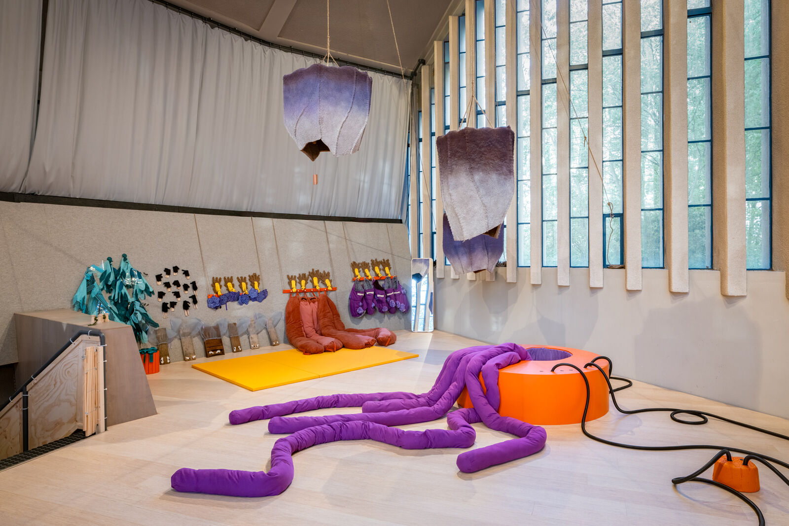 The exhibition is shaped by barnacle interiors, playground platforms inspired from Aldo van Eyck’s designs, modular sculptural costumes, and a large scale tapestry. The abstract structures invite open-ended interaction rather than prescribe fixed behaviors. They invite children to build and unbuild tents and shelters.