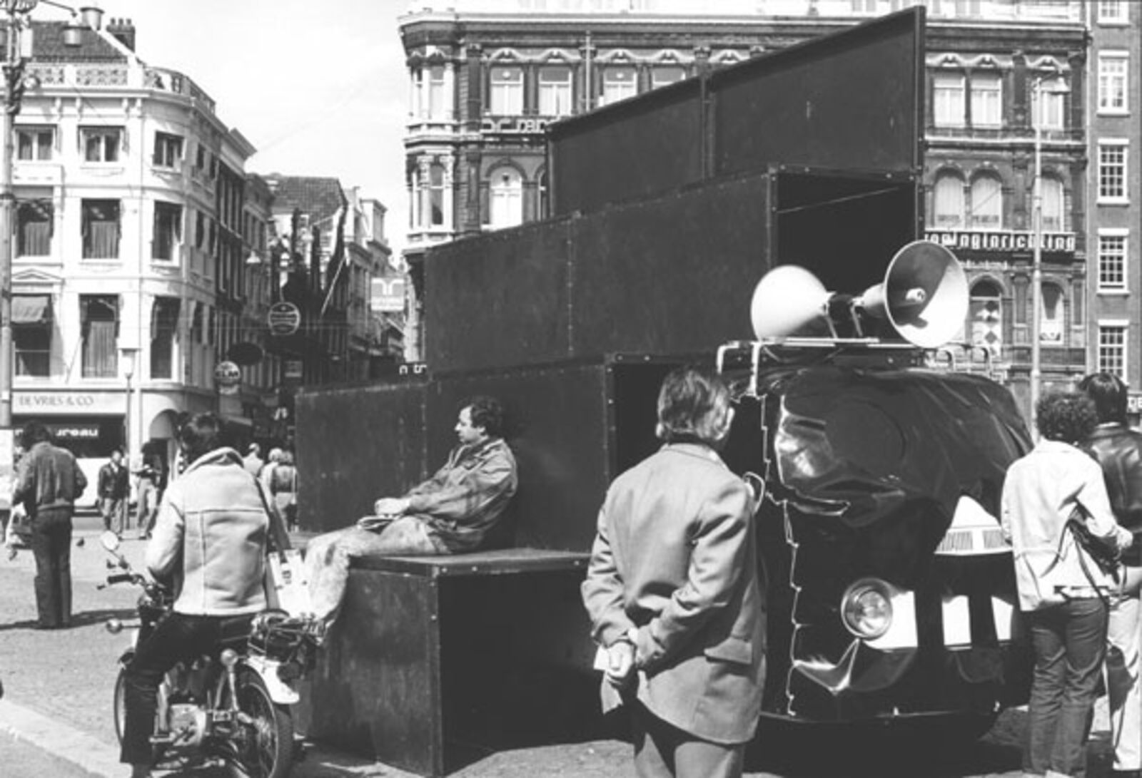 In cooperation with Forum 79 Audio-Visueel in Middelburg, the Museum Boymans Van-Beuningen in Rotterdam, the Van Abbemuseum in Eindhoven and the Corps de Garde Foundation in Groningen, Vito Acconci and De Appel Foundation organized The peoplemobile, a project for five Dutch city squares. The locations, listed consecutively, were: Dam Square, Amsterdam (17-19 May), Dam Square, Middelburg (24-26 May), the Schouwburg Square, Rotterdam (31 May-2 June), Town Hall Square, Eindhoven (5-7 June) and finally the Great Market, Groningen (13-15 June). The peoplemobile consisted of a lorry, twenty-eight metal panels measuring 200 x 90 x 6 cm, and sound equipment. The peoplemobile went to locations chosen by Acconci and remained there for three days, where a different construction was built each day: a table with bench, a hut or a wall. Four speakers were placed on the lorry and broadcast specially made sounds and messages at the location. (Press release De Appel)