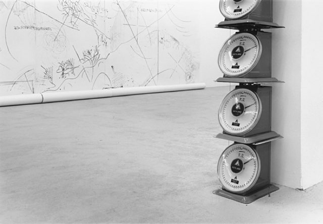 ‘Initially it is difficult to see the diverse work of Christoph Rütimann (Zürich, 1955) as the oeuvre of one and the same artist, but if you are willing to follow his thought processes the correlations will be self-evident. An interest in gravity, a fascination with order and chaos, and the desire to discover patterns in a chaos apparently controlled by chance characterize his work. He uses most diverse media to give form to his ideas: drawings, texts, photographs, microphones and speakers, even pieces of stone and plants can be carrier of meaning. But in all cases there is an internal structure, such as in a palindrome where the letters are identical whether read forwards or backwards, and the text acquires a second meaning. A drawing is realized with the help of a pendulum, which strikes with a certain rhythm. A series of photographs was made by throwing a camera with a self-timer into the air above a field of rapeseed: the 'accidental' results give a coherent image of what the moving camera registered from the air. As if the artist didn't want to take his own artistic judgement as a starting point, he places apparently neutral objects between himself and his work, thus avoiding that the activity becomes the purely personal-artistic form of expression. This consciously created distance links Rütimann’s work with the art of the Seventies, particularly with Conceptual art. What makes his work topical is the fact that it is free of dogmas. The wonder and surprise that can be both the reason for and result of making a work of art are as important as the method used. Imagination is the motor that drives Rütimann, but it can only be mobilized if it is restrained, if it follows the rules of a self-invented and continually changing game.’ (Invitation text by Saskia Bos)