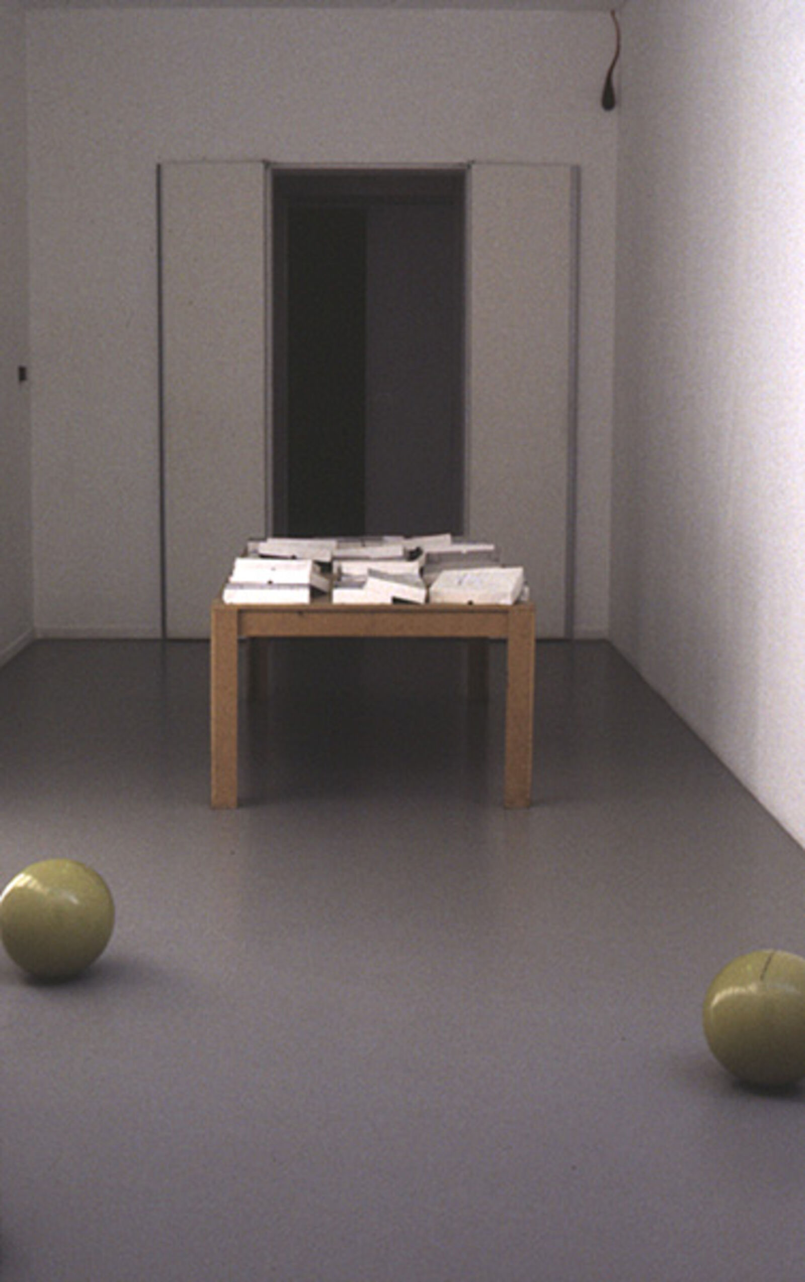 ‘The show presents 12 artists from different countries, who on various levels comment on experiences of time. They deal with, subvert or ridicule Real Time and bring different points of time together. Inherent in the works of art will be aspects of memory, waiting, time loops and slowness. Time is a constructed grid that is ruling our lives, but it still gives us room for experimentation. Different kinds of speed offer different kinds of perceptions of the world - phenomena which the participating artists examine. In the contemporary art world young artists are often launched and again forgotten at high speed. We try to withdraw from this tendency by showing both existing works that have already been presented on other occasions and works especially made for this exhibition - by inviting both lesser and well known artists. The exhibition is organized by the third course of the Curatorial Training Programme at De Appel in Amsterdam. Six young European curators invite you to It always jumps back and finds its way: Phillip van den Bossche (B), Claudine Hellweg (NL), Rita Kersting (D), Raimundas Malašauskas (LT), Cosima Rainer (A) and Paula Toppila (SF).’ (Press release De Appel) Catalogue: It always jumps back and finds its way, 1997. Appelt, Asher, Berchem, Chodzko, Gabriels, Gonzalez-Foerster, De Gruyter, Kern, Lehtonen, Monk, Ruggeri, Schaerf. Text K. Schippers, Phillip van den Bossche, Claudine Hellweg, Rita Kersting, Raimundas Malasauskas, Cosima Rainer, Paula Toppila. English. 80 pp. b.w. 10.7 x 16.2 cm. Soft cover. Design UNA (André Cremer). ISBN 90 73501 30 X. € 8,-.