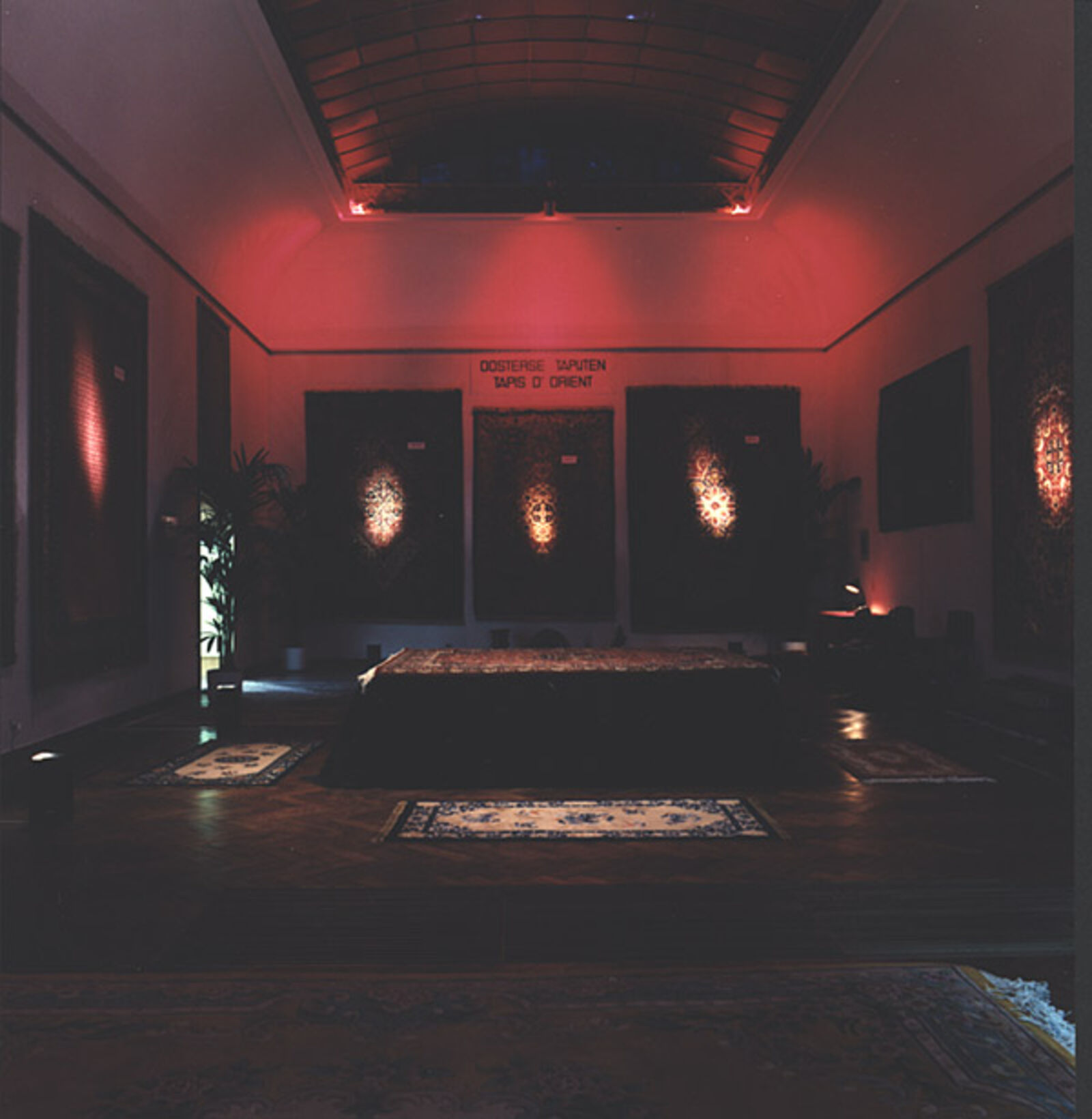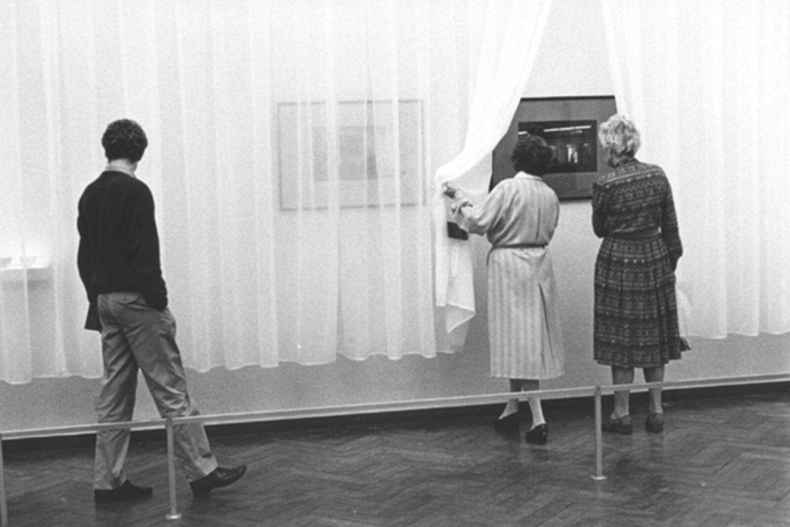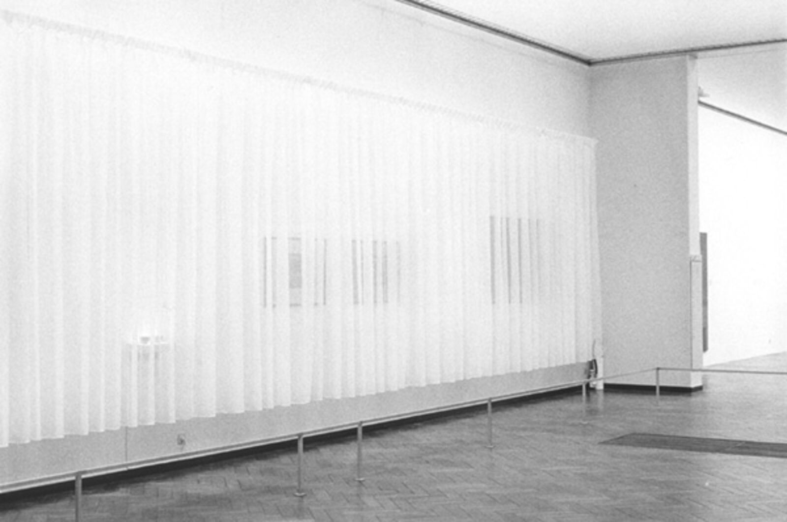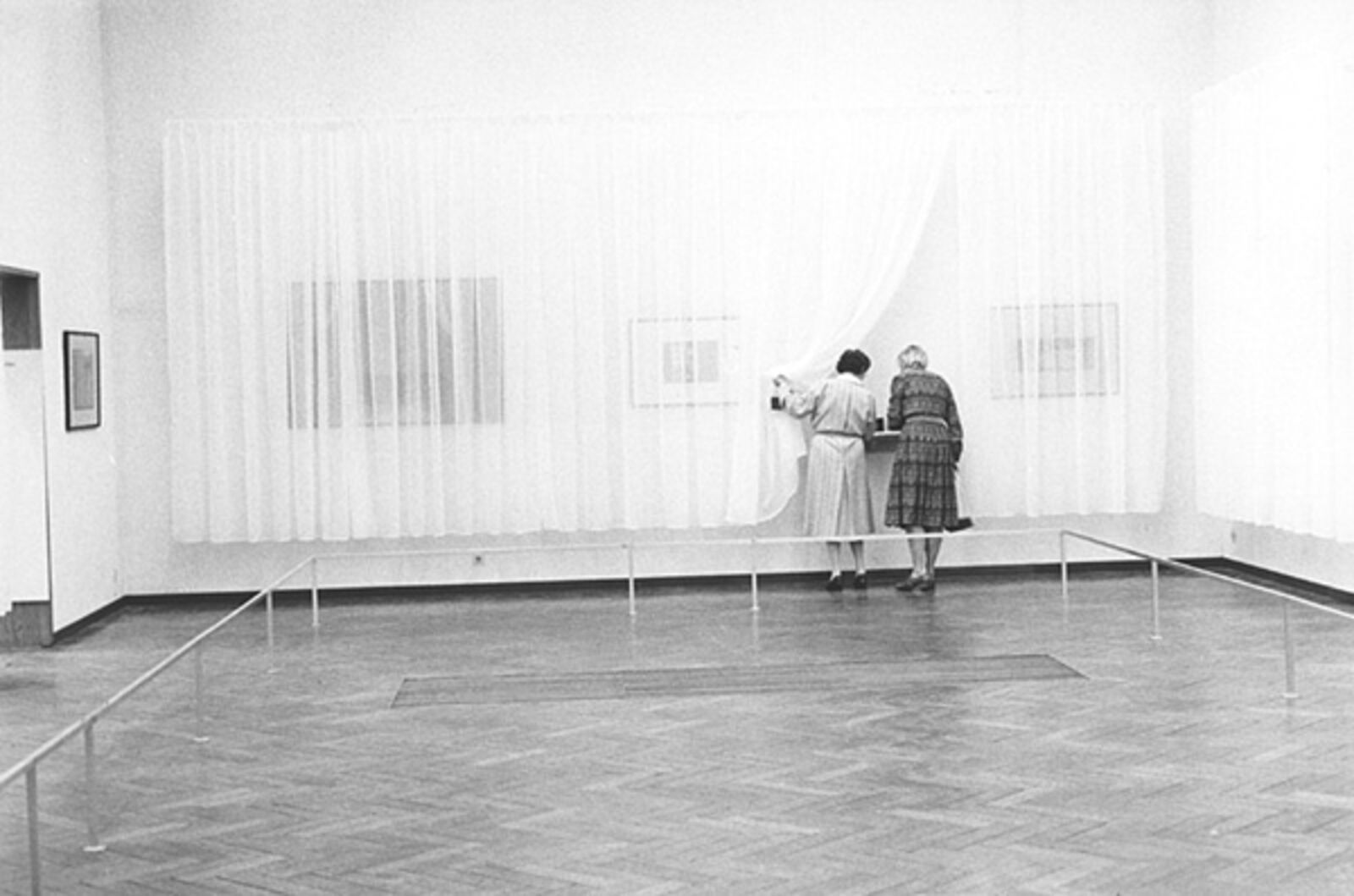 ‘The museum as decor was the point of departure for De Appel’s contribution to the Stedelijk Museum's exhibition from November 21 to January 6, 1986 for which Wim T. Schippers, Guillaume Bijl, Barbara Bloom and Floris Guntenaar were invited to participate. Each person organized room 209a for a period of two weeks. Schippers opted for a display of his own works taken from the collections of Amsterdam's municipal museums. Bijl, in line with his ‘art liquidation projects’, transformed the museum room into an elegant shop selling Eastern carpets. Bloom gave the exhibition space a voyeuristic character by hanging her erotically tinted photos behind the curtains and by placing the railing that normally protects art works close to the work. Guntenaar finally, made the space theatrical by providing one of the short sides of the space with various stage frames, the wings created a perspective in which a figure constructed from coloured wooden blocks pursued its course leaving, here and there, some blocks behind. The As far as Amsterdam goes... exhibition thus had one room that took on four different appearances within the show's duration.’