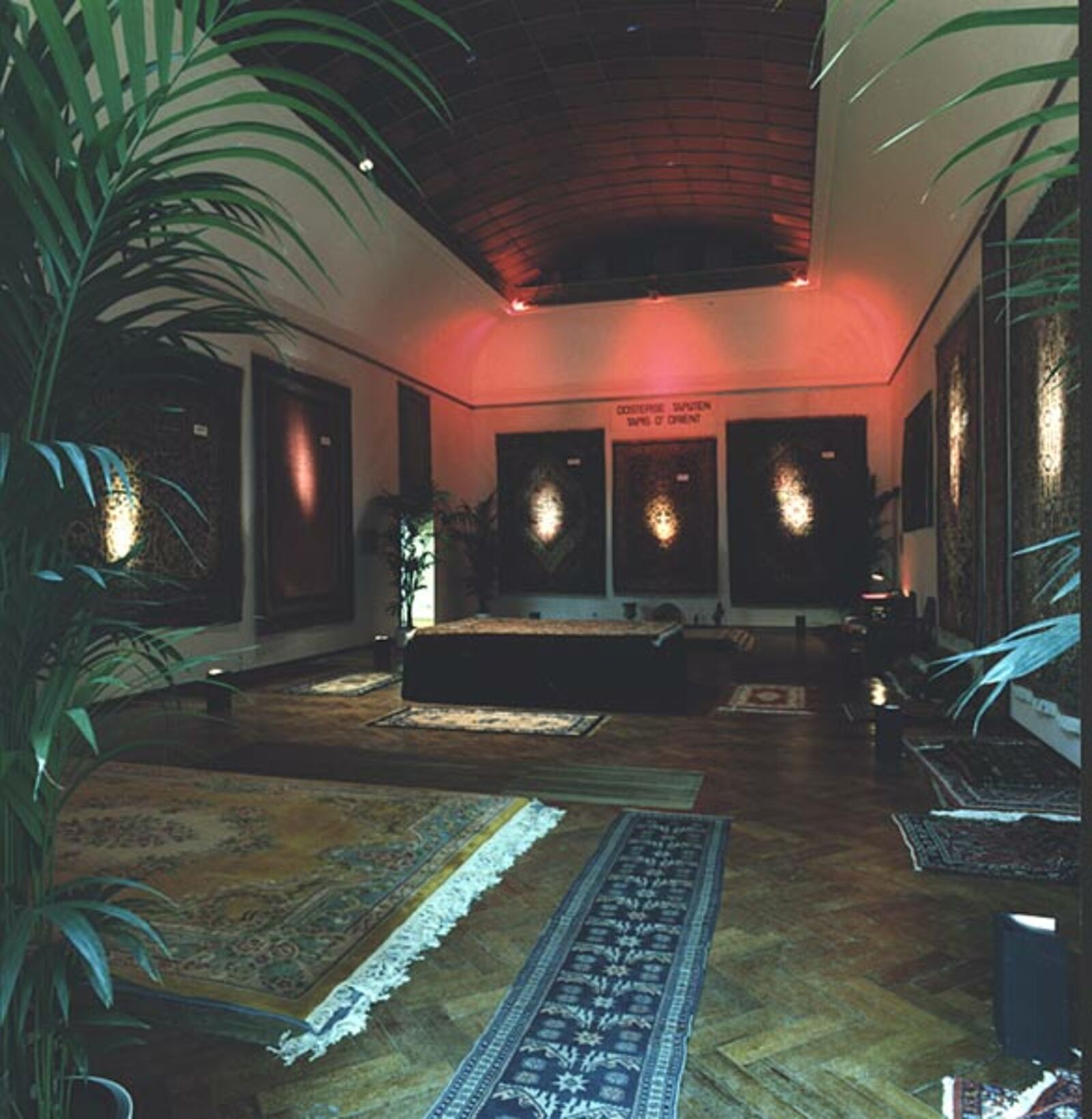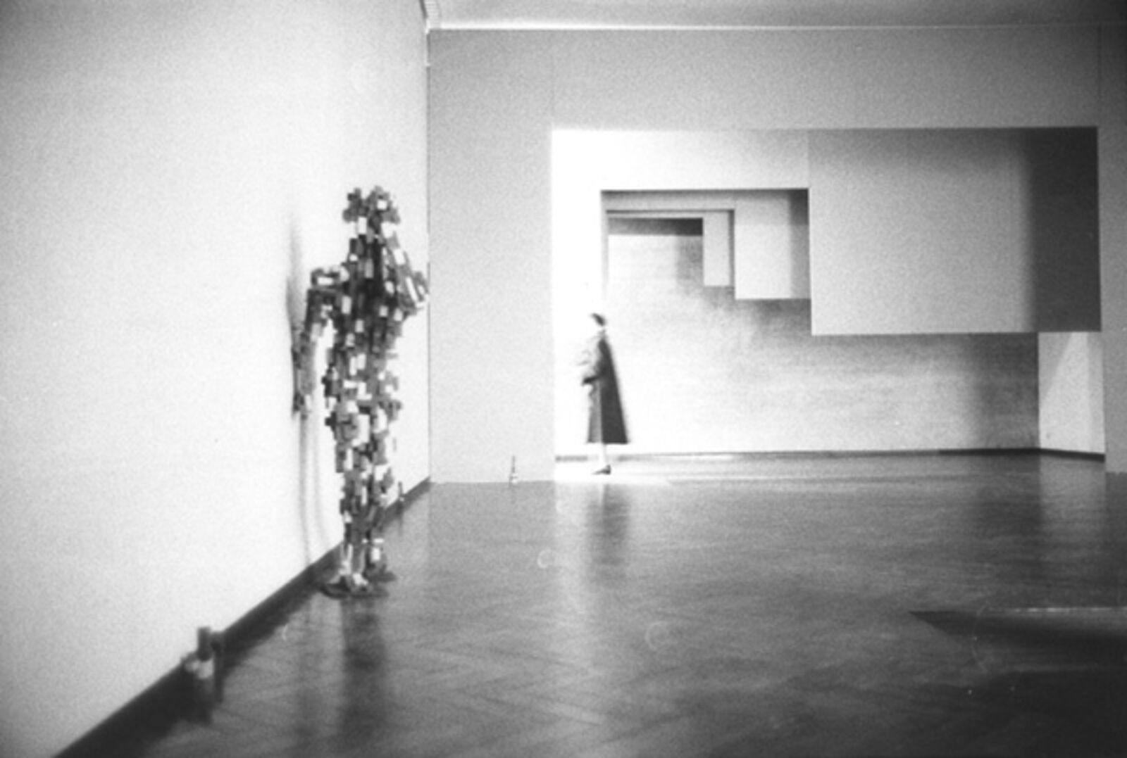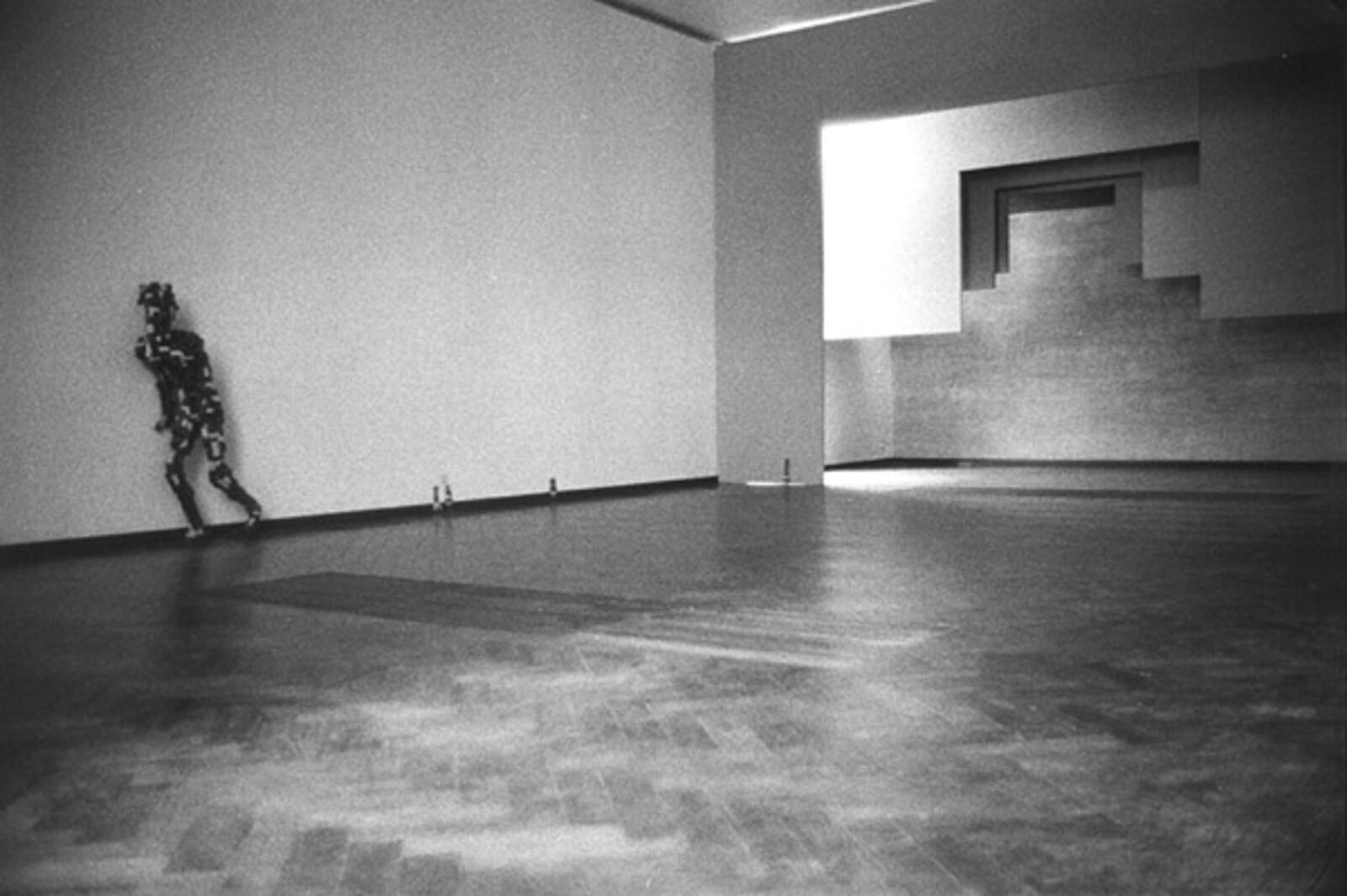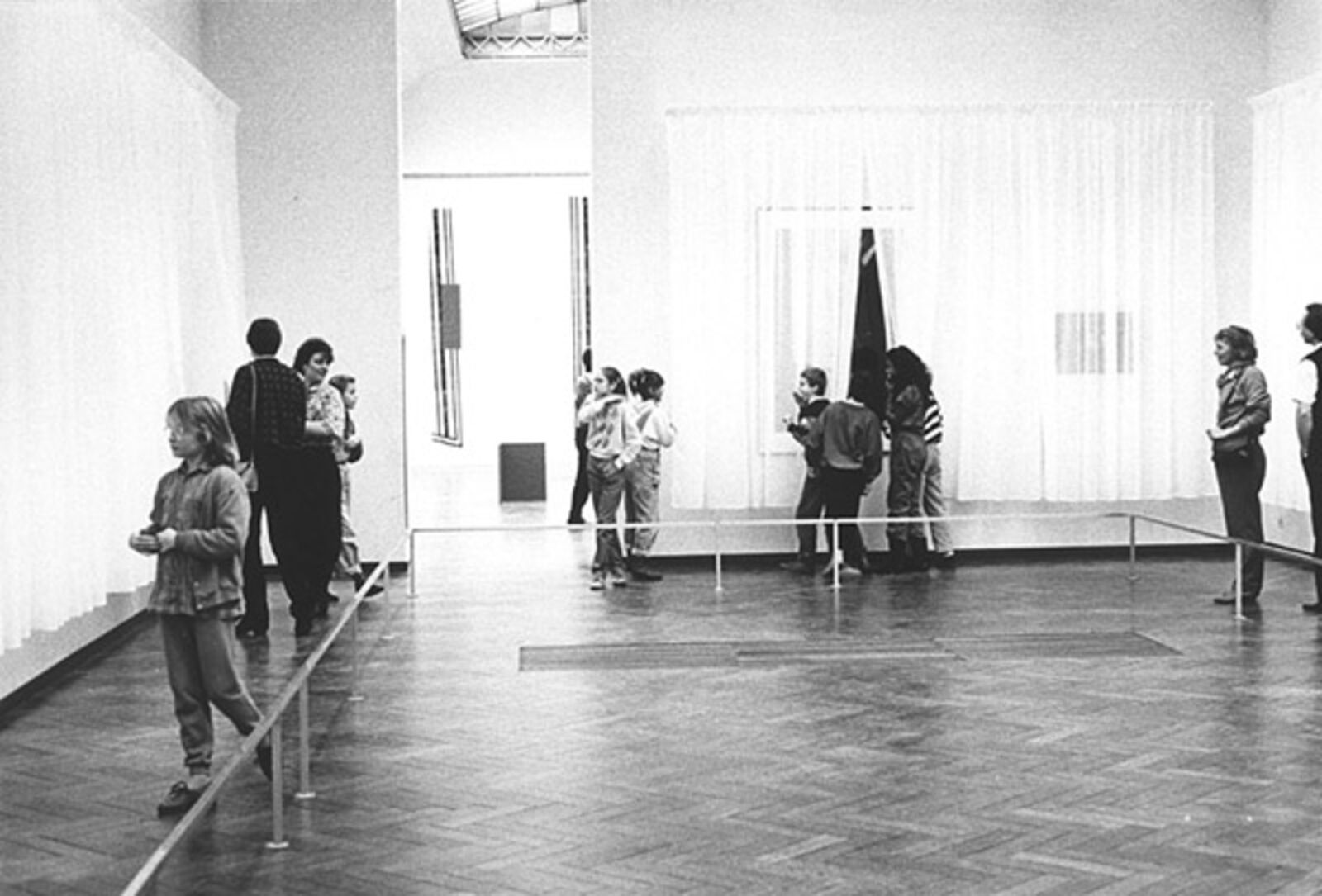 ‘The museum as decor was the point of departure for De Appel’s contribution to the Stedelijk Museum's exhibition from November 21 to January 6, 1986 for which Wim T. Schippers, Guillaume Bijl, Barbara Bloom and Floris Guntenaar were invited to participate. Each person organized room 209a for a period of two weeks. Schippers opted for a display of his own works taken from the collections of Amsterdam's municipal museums. Bijl, in line with his ‘art liquidation projects’, transformed the museum room into an elegant shop selling Eastern carpets. Bloom gave the exhibition space a voyeuristic character by hanging her erotically tinted photos behind the curtains and by placing the railing that normally protects art works close to the work. Guntenaar finally, made the space theatrical by providing one of the short sides of the space with various stage frames, the wings created a perspective in which a figure constructed from coloured wooden blocks pursued its course leaving, here and there, some blocks behind. The As far as Amsterdam goes... exhibition thus had one room that took on four different appearances within the show's duration.’