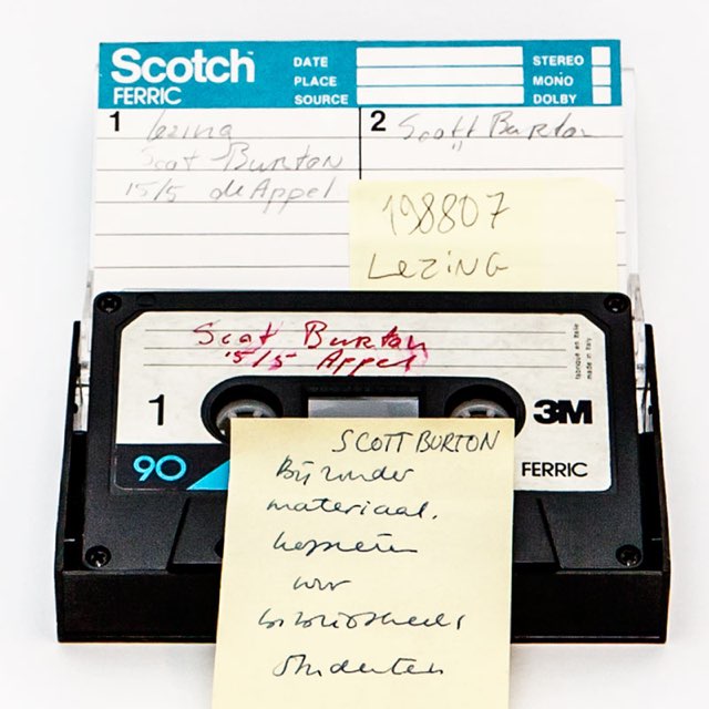 ‘At Documenta 8 last year in Kassel opposite the Orangerie there was a round bench with a tall shrub in the middle of it. Its central position on the lawn gave it the status of a statue. It took a little while to walk up to it which gave you plenty of time to get a good view. In this way the work of Scott Burton became more than just a functional object, it became a piece of sculpture. It oscillated in between 'private sculpture' and 'public furniture'; it wasn't purely an object made in the studio by an artist and intended for an art context. The form was just as important as the function, but it could just as well have been placed somewhere else. 'Public furniture' is not so bound to one place that it can only function in one spot, but in order for it to be used it needs to be placed in an environment. It is not intended exclusively for an art public. Amongst other things Scott Burton (1939) has made performances and theatrical tableaux, but he became known for his chairs and tables. These sculptures are mostly unmoveable because of their weight: his preference is for heavy materials like steel, stone, bronze and granite. In the commissions that Burton has had for work in public spaces, he shows his interest in the human and functional aspects of a work of art. For a covered courtyard of a firm in New York he designed a meeting place in the form of a semicircular bench with a round circle in front of it, also in granite, in which plants have been placed. In a park in Baltimore he got paths laid down, decided on the placing of plants (to provide the shadow required) and designed benches in a form that was intended to encourage conversation between users of the park. Scott Burton participates in the exhibition Furniture as Art in the Boymans-Van Beuningen museum (until June 5) and takes part in the Sculptureroute in Rotterdam '88. This exhibition will open on May 12 and his work there will undoubtedly be discussed in the lecture that Scott Burton is giving in De Appel on May 15.’ (‘Sculpture flirting with furniture’, Newsletter De Appel, 3 (1988) 2.)