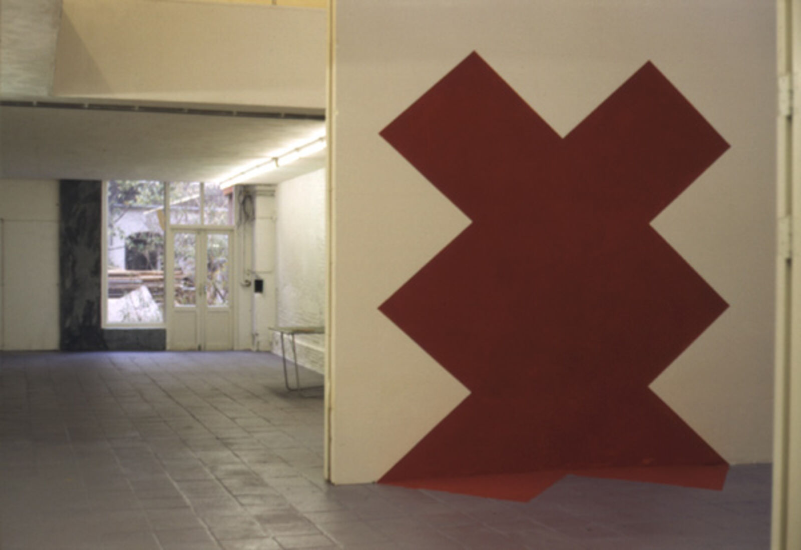 ‘Caramelle’s presentation at De Appel in November 1987 also integrated a dialectical mental structure into a spatial polarity. On entering the space the visitor was confronted with a wall painted red. In the centre a star-like form was left blank, a familiar form which Caramelle used earlier for his light stencils. Both the wall and the painted frame which accentuated the windows refer to the so-called ‘light-paintings’ that Caramelle created by exposing colored paper with stencils laid upon it to sunlight until it attained the required discoloration. Just as the ‘Ereignischarakter’ (event character) is crucial to these light pictures, Caramelle emphasised here the picture's transitoriness through his once-only painting of the wall. Reference is made not only to the duration of a work's creation and its eventual (temporary) presentation, but also to the specific space where it is exhibited. This dialectical principle was crystallised in the ping pong table set up in a narrow corridor, which referred to some of the questions he formulated earlier: sport as art, art as sport? (Kirsten Algera, ‘Art is sport for the few’, De Appel (1988) 2, pp. 15, 16.)