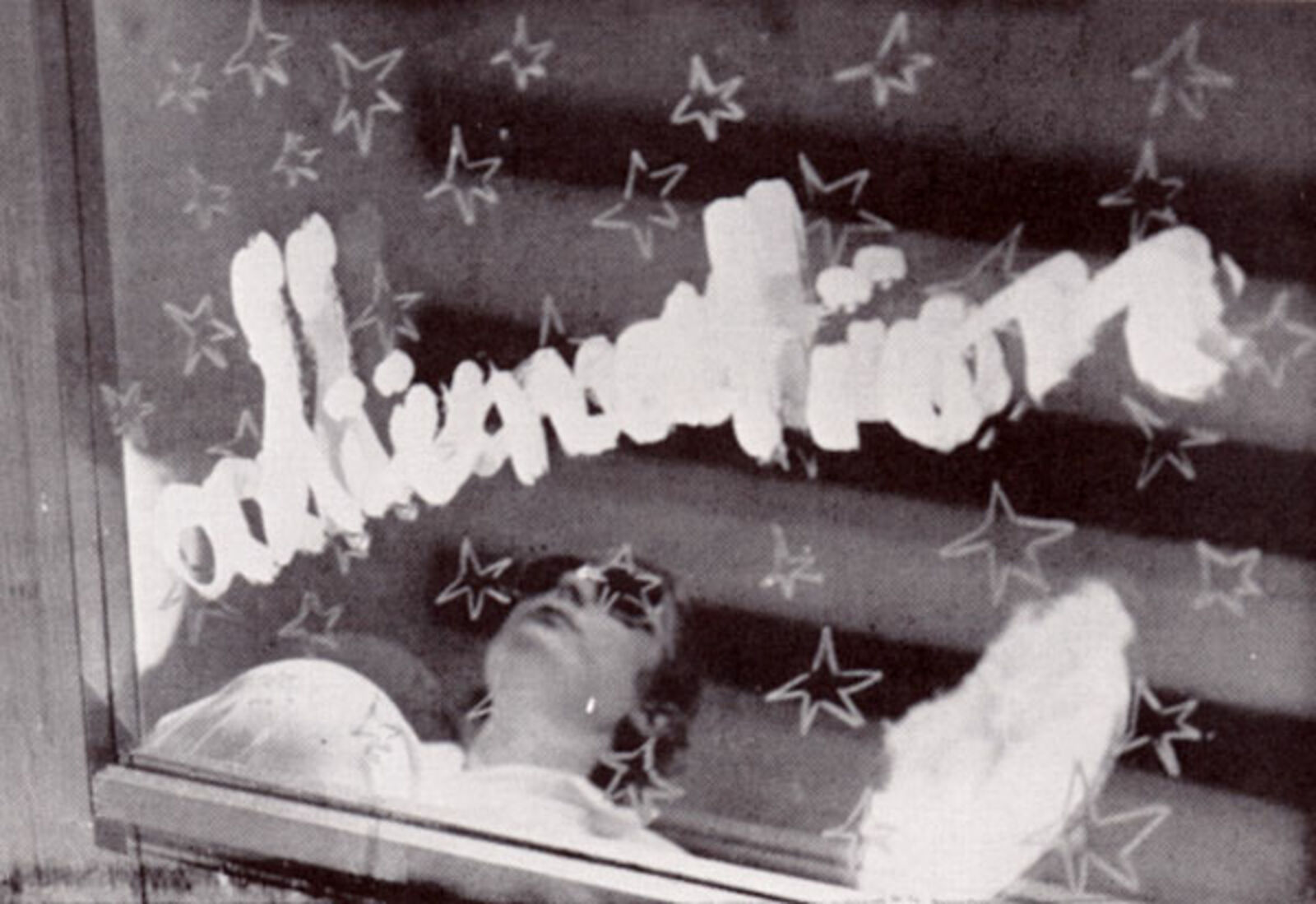 The first scene lasted 15 minutes. Pane entered the performance space, dressed in white pants, a white blouse and high heels of the same colour. She wore sunglasses and had drawn blue stars on her left arm and hand. On the floor had been placed two mirrors, with sheets of glass on top. On the right mirror (from Pane's point of view) stars had been drawn and the word 'aliénation' had been written on the glass. The left mirror was blank, but on the sheet of glass on top the portret of a person wearing shades had been drawn. The sunglasses reflected a mill and a field of tulips. Pane kneeled down behind the mirrors and played two cymbals of cardboard, with cotton wool on the insides. After this silent concert several slides were projected.