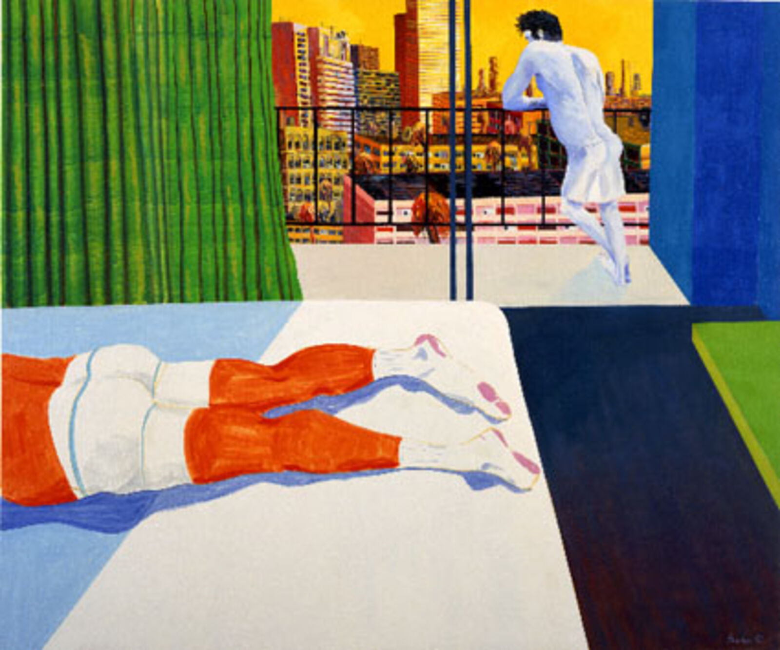 Quite suddenly towards the end of the 1990s, Hawkins began to wield a paint brush, resulting in a diverse series of paintings typified by an extraordinarily flexible aesthetic and wide ranging thematic variation. Brushy “pure abstraction” in garish, lively hues lead into figurative history paintings in which Hawkins reworks his own Creek Indian roots and that place him in the tradition of such urban satirists and American Scene painters as Reginald Marsh and Philip Evergood. More recent vividly painted canvases of bar scenes in the sex-tourism industry of S.E. Asia, described by Hawkins himself as “hallucinations from a Viagra overdose”, sit next to another new segment of his work, “Urbis Paganus,” an ever-expanding series of collages that celebrate the diversity of gender and sexualities under pagan rule.