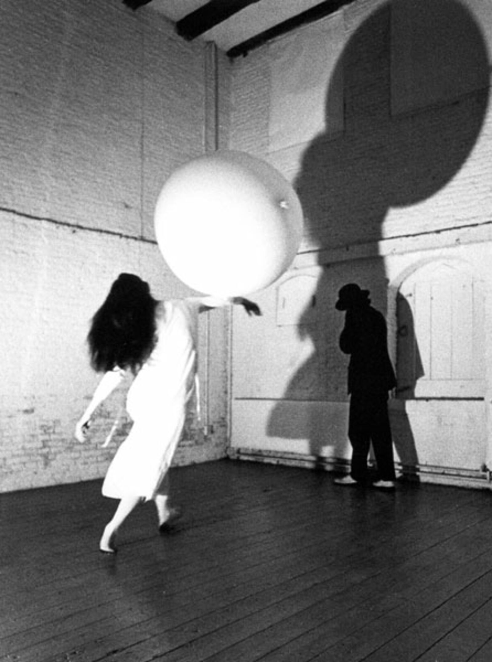 'Amnesiac with his luggage as he remembers nothing, all is suggested by and within the present space; fluid and endless. She lights the space. She burns. She sleeps. We did not know what we were approaching when we first moved into this piece although we now know, we still move into it in the same way.' (Nicolas Cincone & Giovanna Rogante, invitation De Appel, May 1977.)