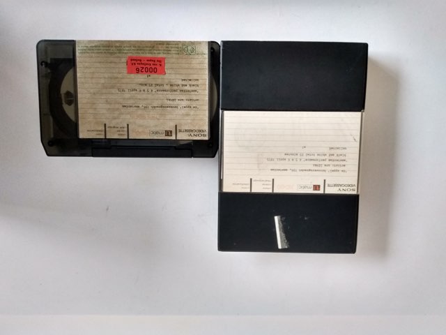 This video is the record of Urs Luthi’s performance at de Appel on 4th, 5th and 6th of April 1975. Every one of these days the artist came to the exhibition space where three self-portraits were hanging. On each self-portrait Luthi was captured having a different look and identity. Having been dressed same as on the self-portatits, he covered the portraits one by one, day by day in black, white and red by spraying the paint on them. By means of slideprojector the lights in the exhibition room went on and off.