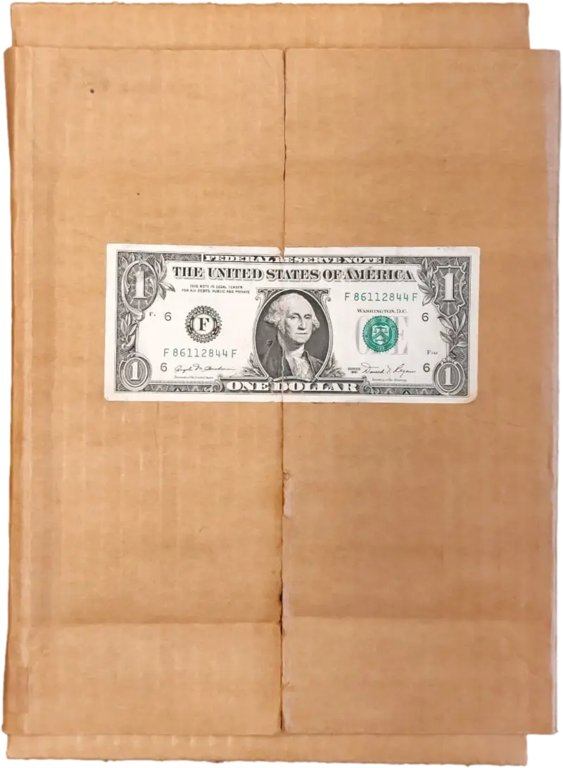 Exhibition catalog containing twenty-seven folded sheets in cardboard box. The box is sealed with 1$ bill.