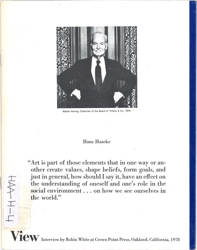 - Hans Haacke – VIEW. Volume I No. 6 November 1978