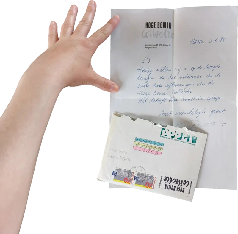 Per post toegezonden door Hoge Bomen Collectie, Zwanenbloemweg 22, 9753 JH Haren Gn (1984) mailart