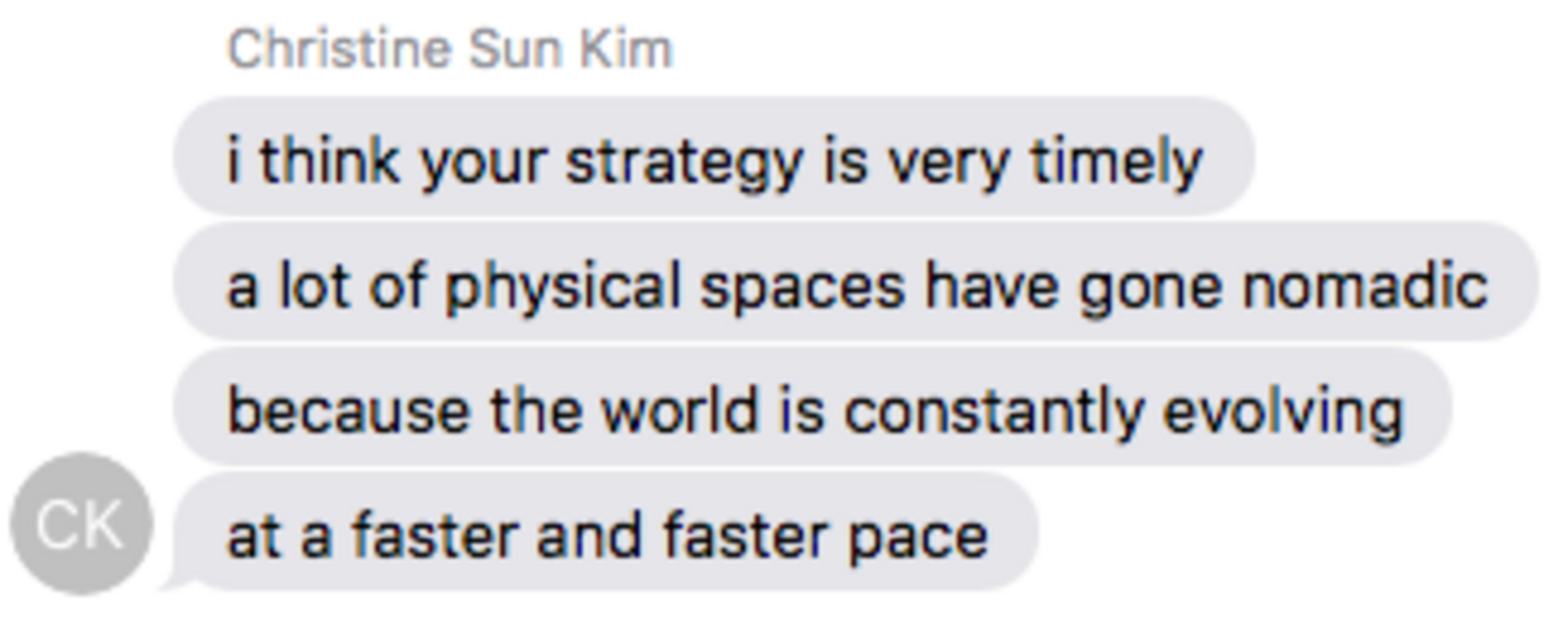 Verder bouwend op dit onderwerp, ontwikkelde het project zich met een reeks van open vragen over de aard van tentoonstellingsmaken, gerelateerd aan het zijn van een instituut zonder vaste tentoonstellingsplek. Wat is de relatie tussen een organisatie zonder tehuis en een kunstenaar die overwegend bezig is met geluid, een medium dat zich vrij door lucht en ruimte verplaats, niet gebonden aan ruimtelijke limiteringen? Wat als men het idee loslaat dat een tentoonstelling zich ook telkens in een specifieke tentoonstellingsruimte moet afspelen? Wat als het zich kan verspreiden naar verschillende locaties in de stad en zelfs ophoudt een tentoonstelling te zijn? En wat als het project de fysieke ruimte zelfs helemaal verlaat?