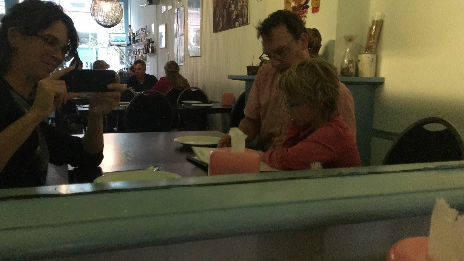 Op het Zuidplein gaan we op zoek naar Bar Erens (mijn familienaam). Want dat is wat The Voice ons opdraagt. Bestaat niet meer. We belanden in café Meeting Point onder het betonnen metrostation, tropisch ingericht met plastic palmbomen tot aan het plafond. Sky Radio staat zacht aan. Beiden bestellen we koffie verkeerd met slagroom.