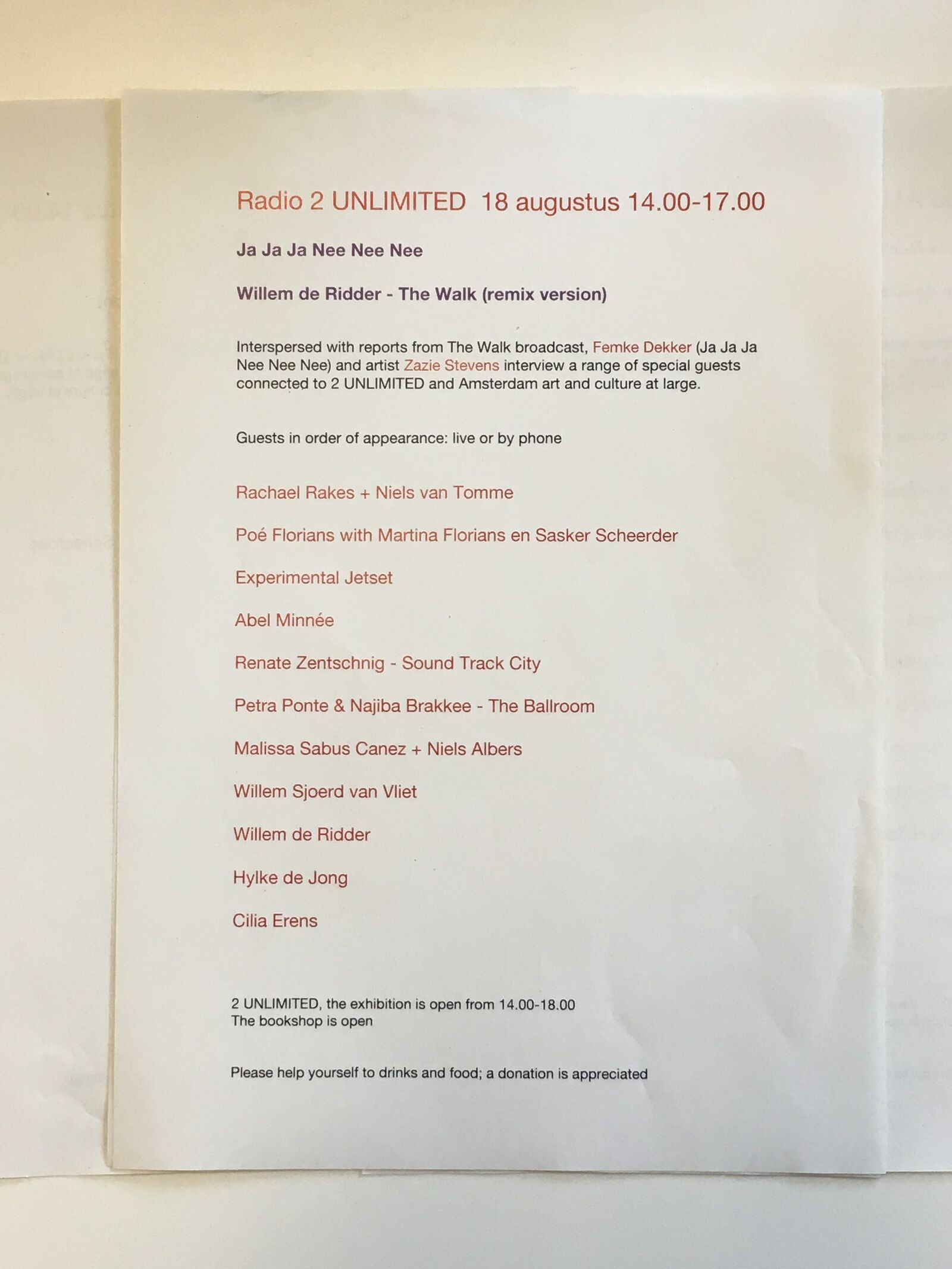 The re-walkers were interviewed by Femke Dekker (Ja Ja Ja Nee Nee Nee) and artist Zadie Stevens during RADIO 2 UNLIMITED that presented a range of special guests connected to 2 UNLIMITED and Amsterdam art and culture at large, including: Willem de Ridder, Experimental Jetset, Petra Ponte & Najiba Brakkee (Ballroom / Live Love Work), Niels Albers & Malissa Canez Sabus.