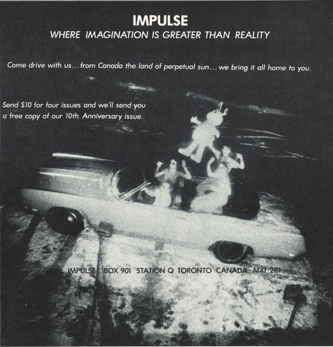 IMPULSE had een sterke focus op kunst en literatuur, en was in visueel en conceptueel opzicht een voorbeeld voor andere tijdschriften. Het tijdschrift was een voortdurend onderzoek om de beste Canadese en internationale kunstenaarsteksten te presenteren met al de facetten van die tijd. Onder de redacteuren waren Sylvère Lotringer van Semiotext (e) en Willoughby Sharp van Avalanche magazine. In IMPULSE werden bijdragen gepubliceerd van een scala aan boeiende kunstenaars en schrijvers, onder wie Kathy Acker, Hans Haacke, Jean Baudrillard, William Burroughs, Colin Campbell, Marguerite Duras, Jenny Holzer, Patti Smith en Michael Snow.