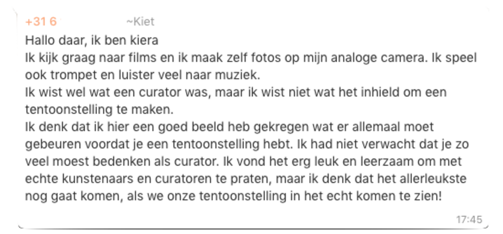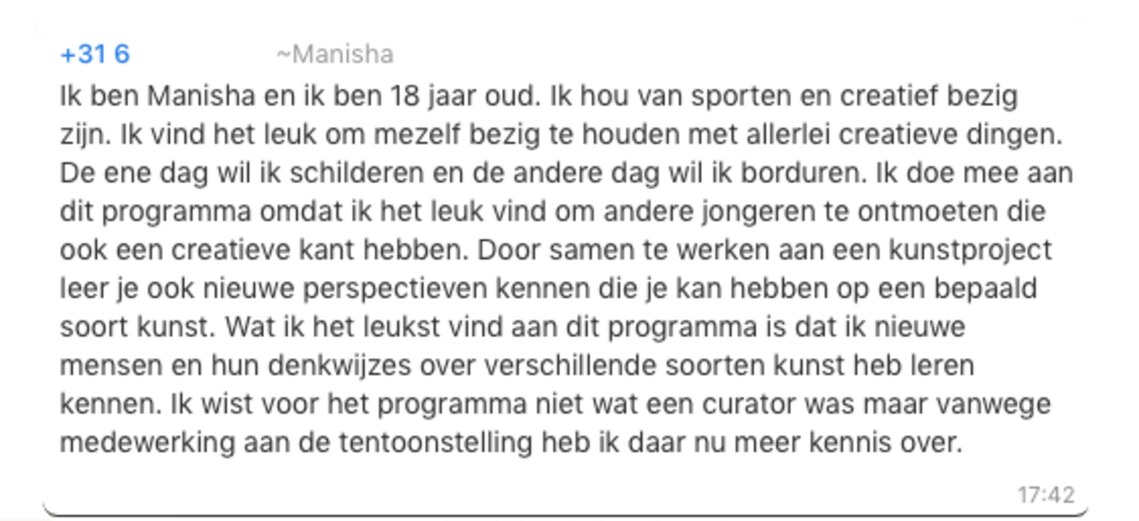 Met curator Bas Hendrikx verkenden de jongeren wat een curator is en doet. Gevraagd naar onderwerpen die voor hen belangrijk zijn, droegen de jonge curatoren duurzaamheid en leven met natuur aan. Samen met de internationaal opkomende en lokaal gevestigde kunstenaar Farida Sedoc onderzochten de jongeren wat het betekent om kunstenaar te zijn en hoe dit verbonden is met de samenleving en je persoonlijke leven. De groep legde verbanden tussen het belang van specifieke texturen en textiel in hun leven door middel van visuele referenties naar muziek, beelden en video’s. Een belangrijke referentie voor de jongeren was Stevie Wonder’s album uit 1979 Journey Through The Secret Life of Plants dat een gemeenschappelijke interesse in natuur en planten naar voren bracht.