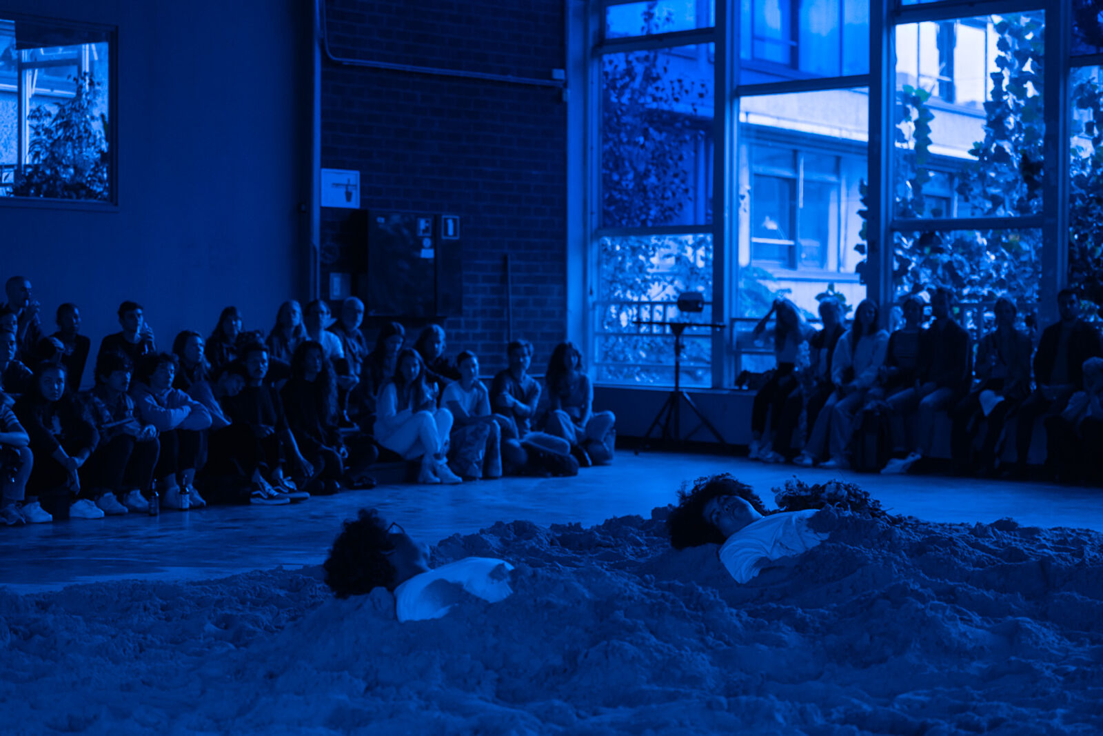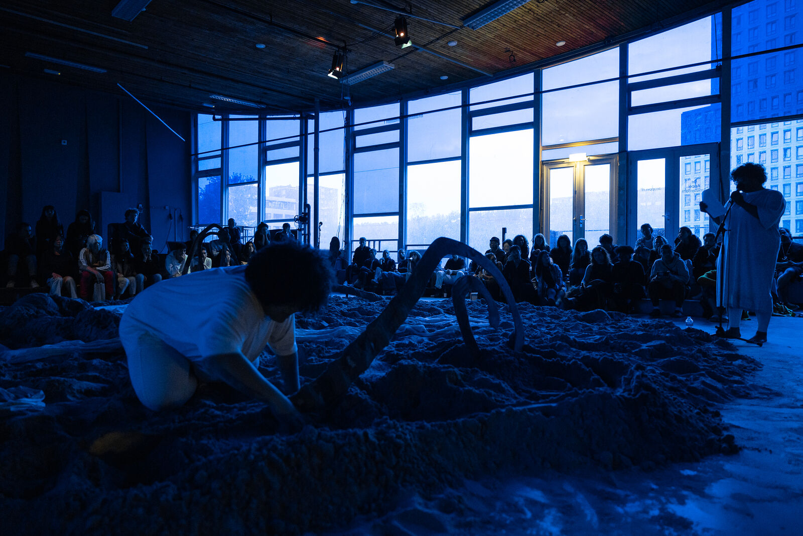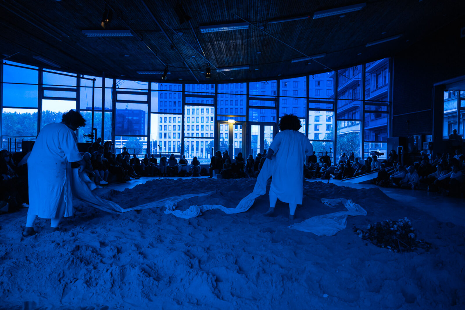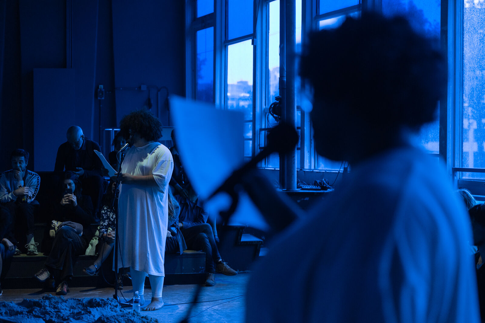 We zijn vereerd de kunstenaar Jota Mombaça te mogen verwelkomen voor episode 1 van super feelings: sinking could be. In deze episode, die zowel een performance is als het residu ervan, laat Mombaça de Aula baden in blauw licht en de vloer bedekken met een tijdelijk landschap van zandduinen.