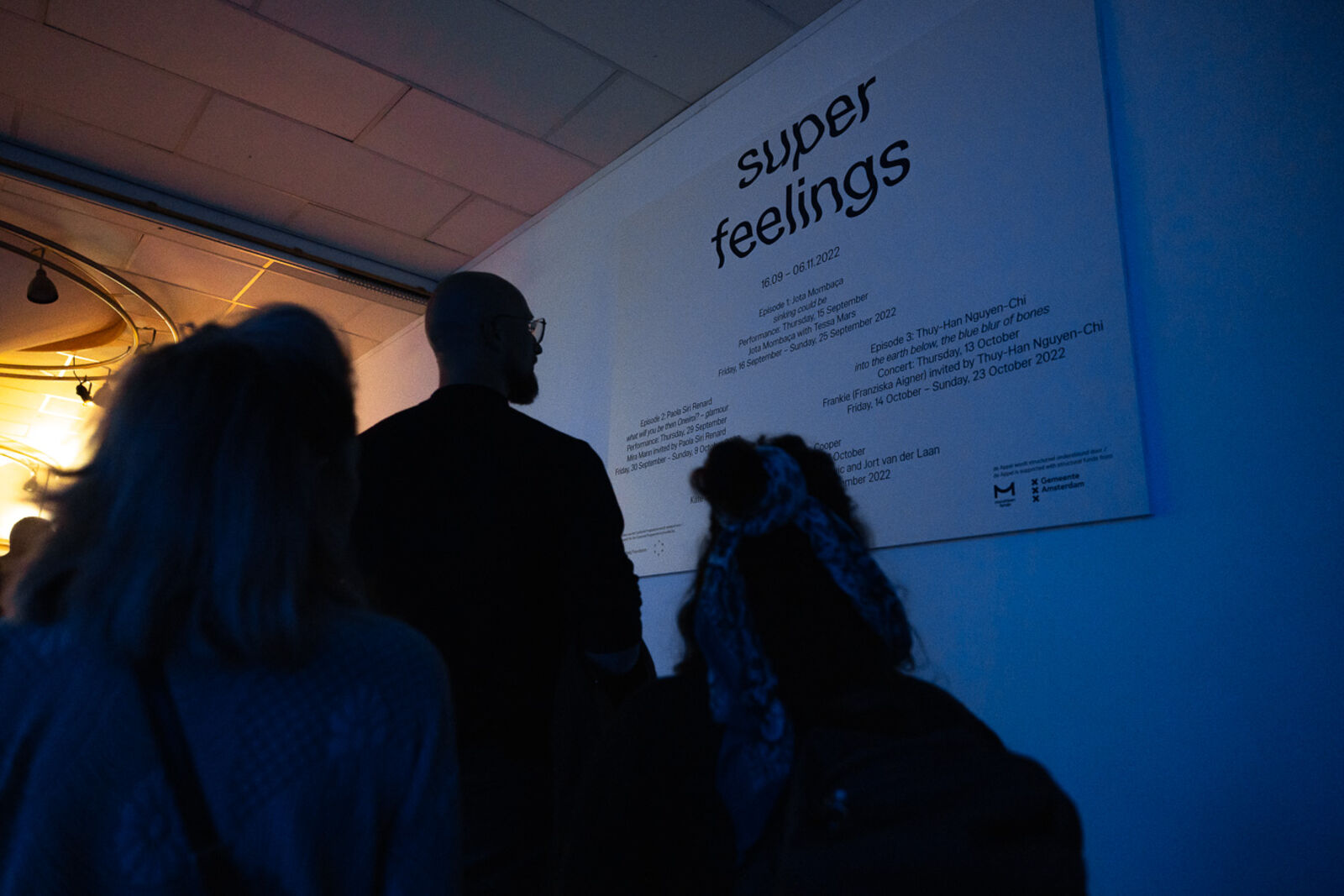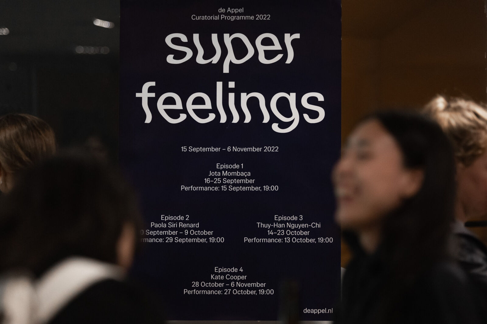 super feelings is een vierdelige tentoonstelling, publiek programma en reader, die zich bij de Appel outvouwt gedurende de herfstmaanden van september, oktober en november 2022. super feelings is ontwikkeld door de deelnemers van het Curatiorial Programme 2022.