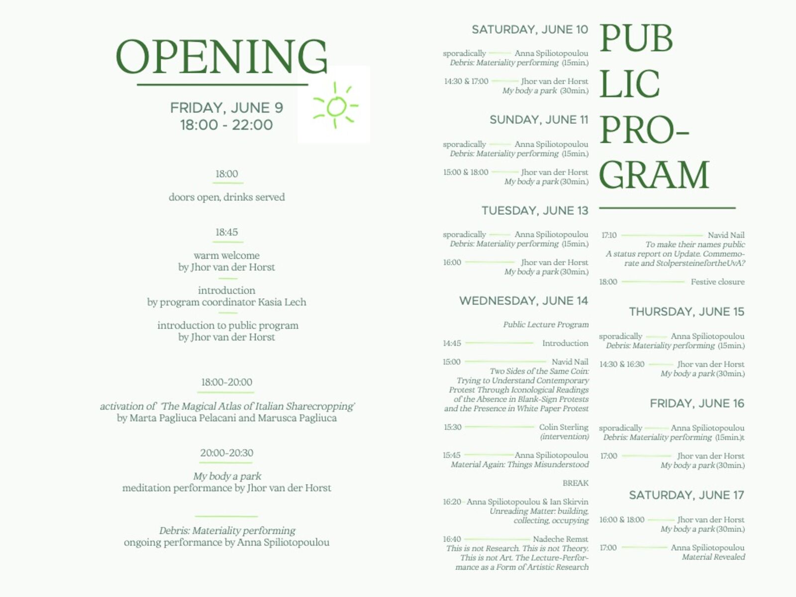 De twaalf deelnemers maken gebruik van methoden van artistiek onderzoek, belichaamd in verschillende vormen. Hun huidige onderzoek draait om kunst en performance - het verwerken, veranderen, verweven, omhullen en onthullen van materiële narratieven. De presentatie wordt aangevuld met een publicatie en een publieksprogramma, bestaande uit gastcolleges, performances en installaties.