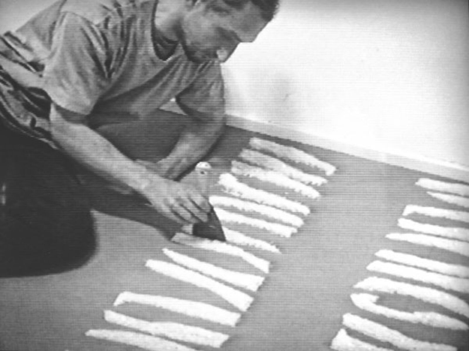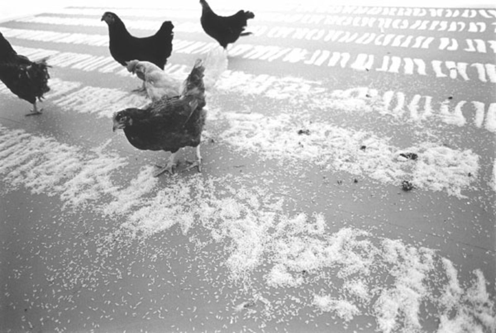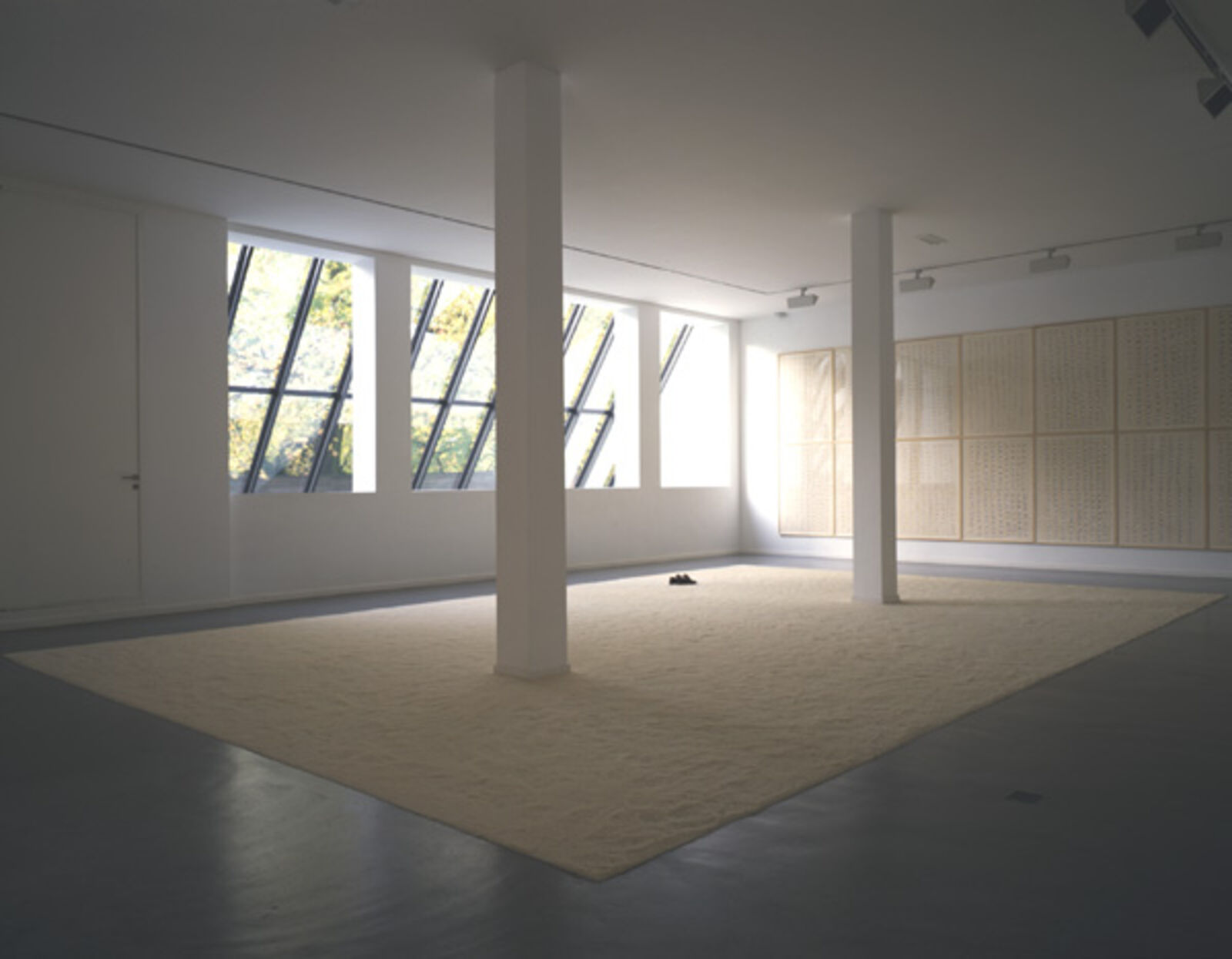 Gia Edzgveradze werd in 1953 geboren in Tbilisi, Georgië. Sinds 1989 woont hij in München. In Edzgveradze's kunst ademt echter nog altijd de sfeer van zijn geboorteland, zoals het sobere, ascetische en contemplatieve karakter van de Byzantijnse cultuur waarvan in Georgië sporen te vinden zijn. Edzgveradze noemt zich een geesteskind van de jaren zestig: op een luchtige manier is hij op zoek naar spiritualiteit en bewustzijnsverruiming. Op zijn achttiende had hij, wat hij noemt, een ervaring die hem religieus, spiritueel inzicht gaf. De kennismaking met postmoderne kunst uit het Westen heeft zijn belangstelling voor inhoud boven vorm alleen maar versterkt. Met een minimaal beeldend idioom ontstaan er reusachtige geschetste 'cartoons'. In deze sobere, visuele taal worden voorwerpen, dieren maar ook religieuze symbolen verweven. Een herhaling van getekende handen lijkt op een verzameling votiefbeelden. Een vulpen wordt enorm uitvergroot getekend als een in de lucht rijzende sculptuur. Het onderste paneel ligt op de vloer en laat vingers zien die uit zichzelf niet kunnen schrijven. Over herkenbare figuren heen of als enige beeldvulling van het hele oppervlak worden golvende rijen abstracte, stenografische tekens 'geschreven'. De ritmische verdeling en het nerveuze handschrift maken het op verschillende manieren leesbaar. Door de meerdere betekenissen en de zorgvuldige uitvoering krijgt het werk een icoon-karakter. In Edzgveradze's installatie werden humor en ernst verweven. Balancerend tussen triviaal en spiritueel stonden de 'acteurs', dieren die verplaatst waren van hun natuurlijke naar een culturele omgeving, in hun verstoring van een evenwichtig patroon, voor beperkingen van het menselijk bewustzijn. (Gebaseerd op de uitnodigingstekst van Edna van Duyn)