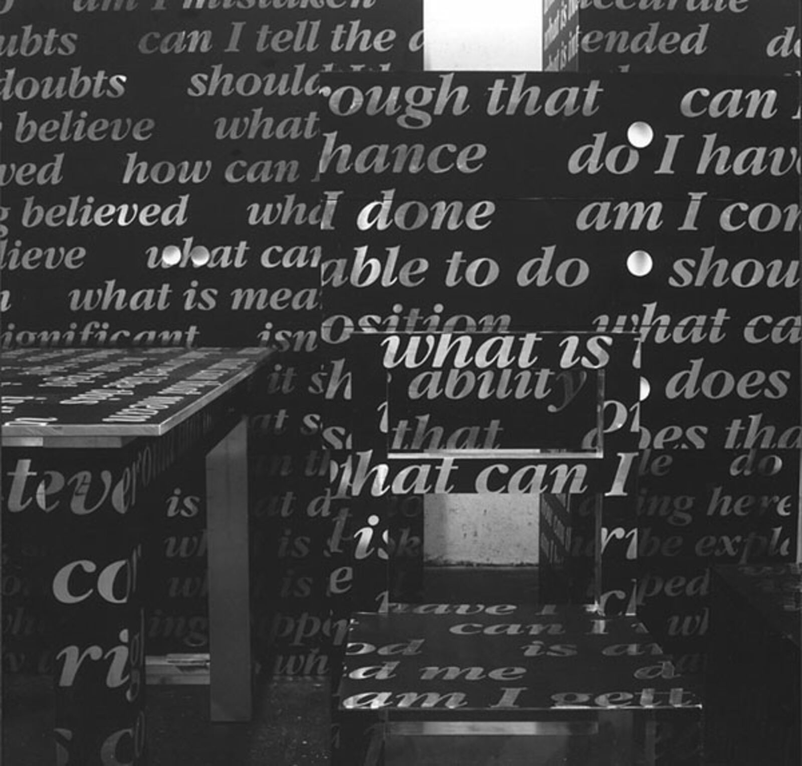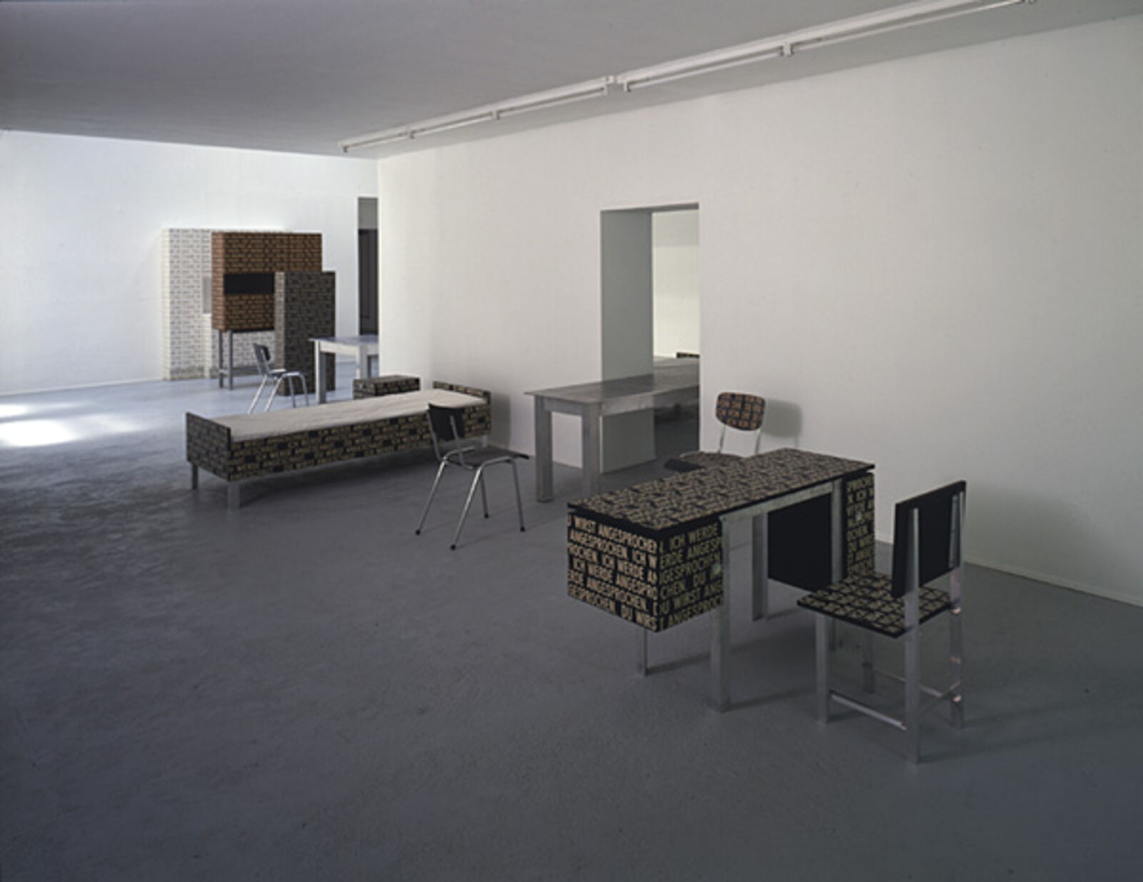 V.v.n.a.: Zwei Schreibtische mit zwei StĂŒhlen, 1992; Zwei StĂŒhle, 1991; Kleine Hermeneutik des Schweigens, 1992 ; Zwei Betten und zwei NachtkĂ€stchen, 1991; Kleine Hermeneutik des GesprĂ€chs, 1991; Hochschrank, 1992; Schrank, 1990; KĂŒche, 1991