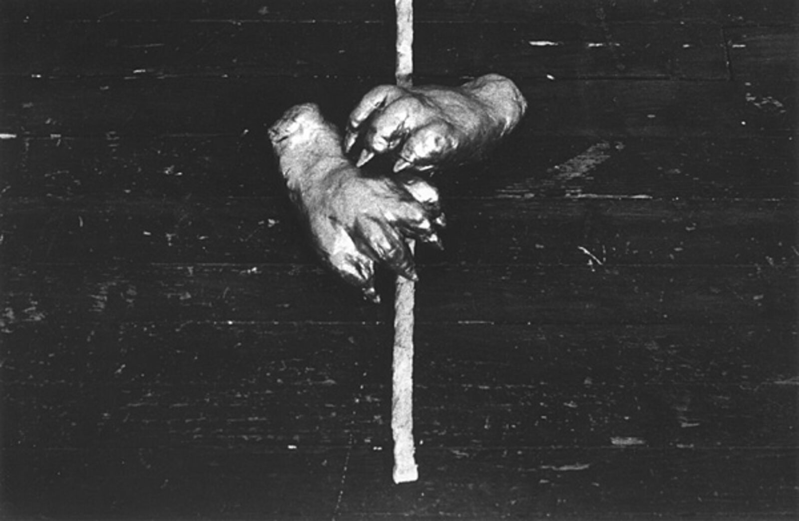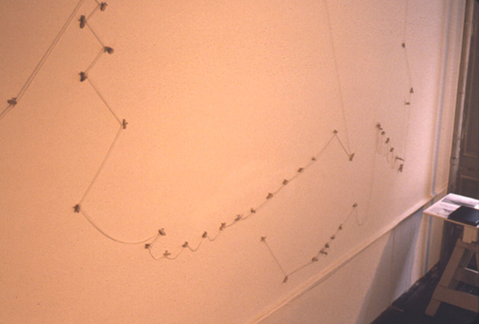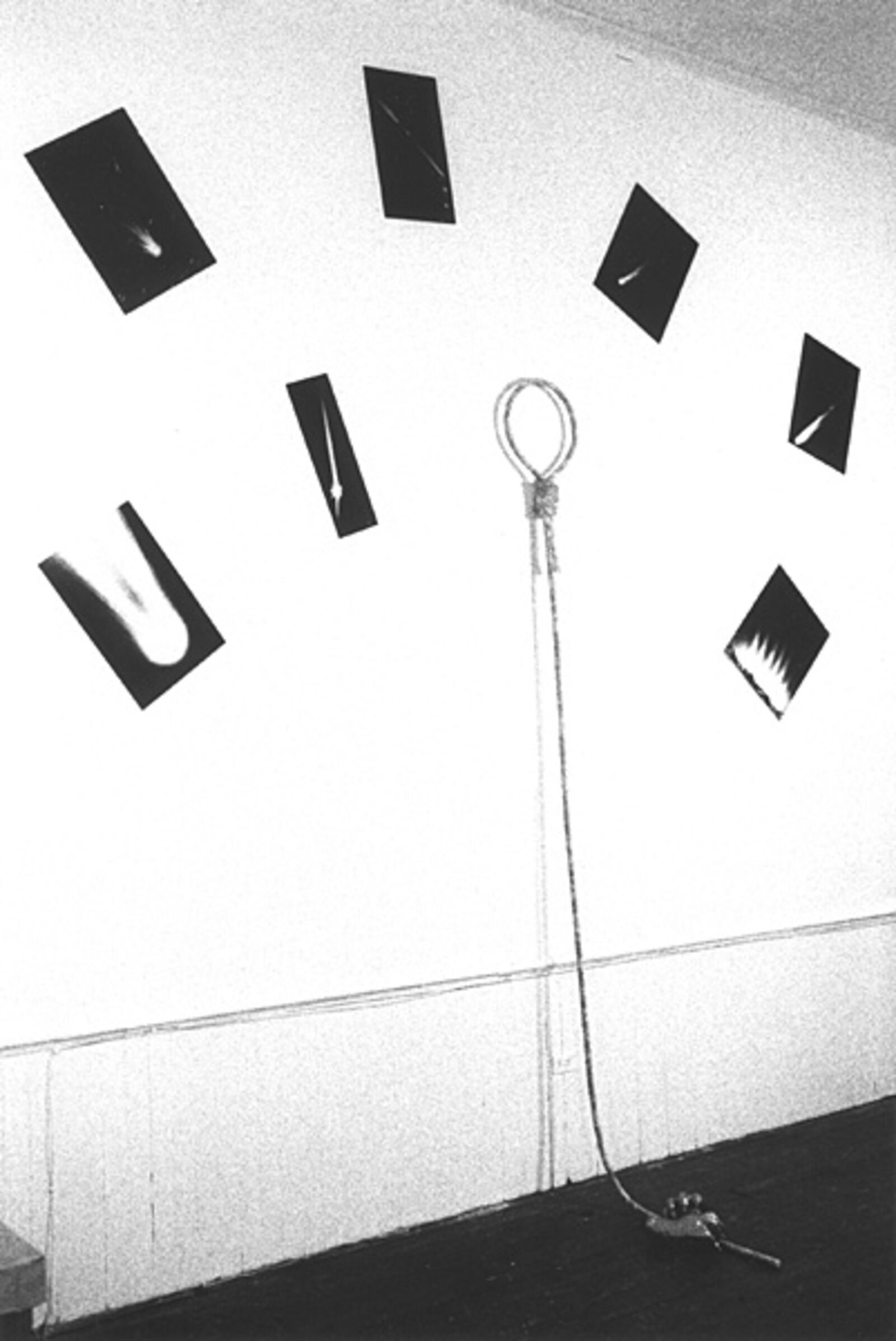 Nikolaus Urban: Paws and comets: installatie op wand en vloer bestaande uit foto's van kometen, een met klei ingesmeerde lus van touw en een sculptuur van dierenklauwen. Glass Installation: Broadway, Broadway... Installatie van wijnglazen op een tafel. Van de twee aan twee gerangschikte glazen is steeds één heel en één gebroken. De glassplinters zijn verzameld in de hele glazen. (12-24 november, Franklin Furnace)
