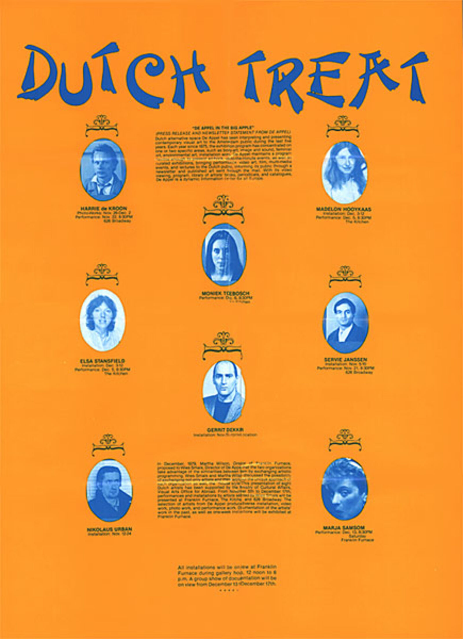 'In december 1979 bespraken Martha Wilson van Franklin Furnace Archive in New York (een centrum dat qua opzet met Stichting De Appel te vergelijken was) en Wies Smals van De Appel de mogelijkheid om tot een uitwisseling van kunstenaars en hun werk te komen. De opzet was dat ook de persoonlijke benadering binnen ieder instituut en de zogenaamde huisstijl in die ruil tot uitdrukking kwam. De Appel vroeg hiertoe subsidie aan bij het ministerie van CRM, afdeling Beeldende Kunst Buitenland, en ontving ca. fl. 25.000,- om de reis van 7 kunstenaars en de organistatie van een tiental manifestaties in New York te realiseren. Helaas was het onmogelijk voor Franklin Furnace een subsidie voor de Amerikaanse kunstenaars in Nederland te verkrijgen. Wel kan Franklin Furnace haar ruimte en faciliteiten voor zes weken (van 5 november t/m 18 december) aan de kunstenaars uit Nederland aanbieden. Bovendien krijgen wij een weekeinde (5 en 6 december) de ruimte van The Kitchen (een centrum gespecialiseerd in performance, video, dans en geluid) om daarin een aantal performances te laten plaatsvinden. Ook voeren enkele kunstenaars akties uit in een studioruimte aan Broadway 626 (in het weekeinde van 21 en 22 november). De Nederlandse kunstenaars laten een afwisselend programma zien dat installaties, video presentaties, fotowerken en performances omvat. Een poster ontworpen door Marja Samson kondigt de manifestaties aan. Dit alles wordt begeleid met een uitgebreide dokumentatietentoonstelling over de aktiviteiten in De Appel in het algemeen.' (Persbericht De Appel, 22 oktober 1980.)