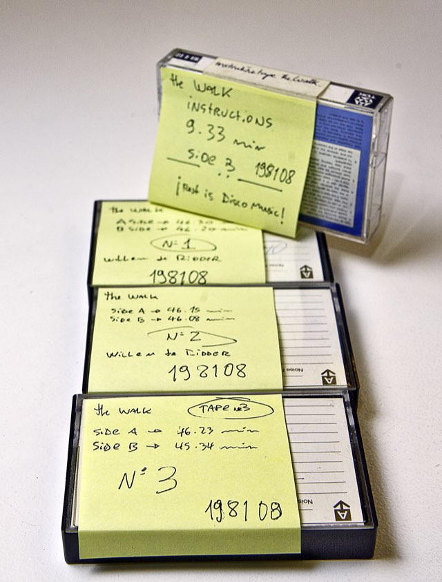 'Terwijl de VPRO iedere week een radiokunstwerk uitzendt en de VARA proefnemingen doet met ‘t 3-dimensionale hoorspel zijn er iedere week via de NOS aanwijzingen te horen voor The Walk. Als U over zo'n minicassetterecorder met bijbehorend koptelefoontje beschikt, kunt U een RAR (Radio Art Resonantie) ondergaan die U niet licht zult vergeten. Iedere week wordt er vanuit De Appel vertrokken. Na het ontvangen van voorbereidende instructies, kunt U één, twee of drie cassettes kopen (plus de 64 pagina’s tellende Radio Art Gids (RAG) voor een tocht door Nederland die enkele dagen kan duren. U hoeft alleen maar de instructies op te volgen en voordat U 't weet zit U in de trein, de bus of de boot, op weg naar een onbekende bestemming en zendt de NOS voor U alleen: speciale aanvullende instructies uit. Vanaf woensdag 8 juli (11-18 uur en 20-22 uur) & donderdag 9 juli (11-18 uur) kunt U vertrekken vanuit De Appel, Brouwersgracht 196, Amsterdam. Vanaf die datum iedere woensdag en donderdag tot eind augustus.' ('Get radioed when in Holland. Don’t miss The Walk, Radio Art of Willem de Ridder', De Appel 1 (1981) 1, p. 24.)