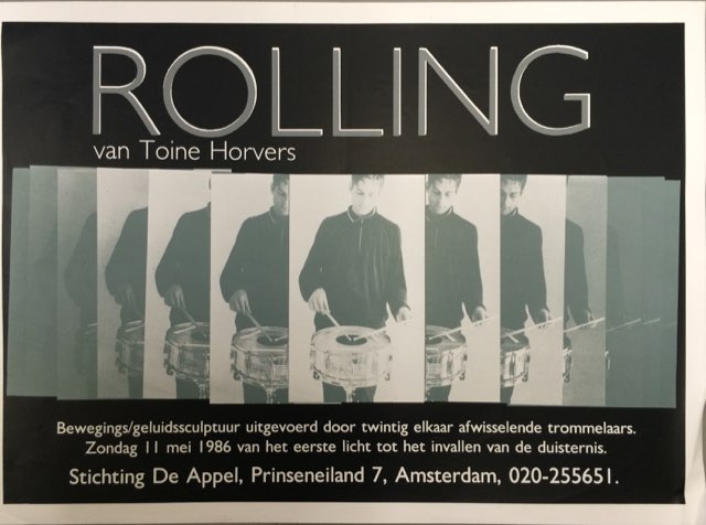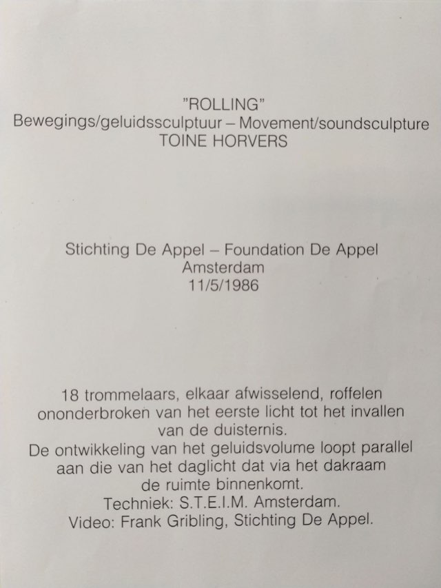 ‘Het idee ontstond vanuit het denken over de nieuwe publieksruimte van De Appel. De grote zware muur die de ruimte over de lengte in tweeën deelt, is in het midden voor een deel weggebroken om, samen met een doorbraak naar boven, een hoge open ruimte in het gebouw te krijgen, met een omloop op de eerste etage. Het theatrale aandachtspunt dat hier ontstaal, wordt nog eens extra benadrukt door een paar dakramen boven deze ruimte. Het plan is om het weggebroken stuk wand als het ware tijdelijk te herstellen door een overbruggende energie, door middel van tot sculptuur geconcentreerde beweging en geluid. Op zondag 11 mei zullen twintig trommelaars, elkaar afwisselend, ononderbroken roffelen van het eerste licht tot het invallen van de duisternis. De ontwikkeling van het geluidsvolume loopt parallel aan die van het daglicht dat via het dakraam in de ruimte komt. Een wezenlijk element voor een dergelijke sculptuur is steeds de spanning tussen de grote vorm in de tijd en de kleine bewegingen, trillingen, waarmee die grote vorm tot stand komt. In het geval van Rolling (rollen) bestaat die vorm uit de opkomst en neergang van het daglicht. Het geluid ontstaal aarzelend uit het niets, is een tijdlang onstabiel aanwezig en verdwijnt weer in het niets. In feite is er dus nauwelijks sprake van 'vorm', want zowel door het onberekenbare karakter van het licht als door het aftastende van de trommelaars die door dat licht gestuurd worden, blijft het resultaat kwetsbaar. Een later project in de Koopmansbeurs te Amsterdam (september 1986) zal een nóg gevoeliger uitgangspunt hebben. Daar wordt de hoeveelheid daglicht die door het glazen dak van de Goederenbeurs binnen komt, bepalend voor het volume van het stemgeluid van deelnemende personen én voor het aantal personen dat dal volume moet opbrengen. Behalve de onstabiliteit van het licht en de aftastende menselijke stem, is hier dus ook het aanbod van uitvoerende personen een wezenlijk bestanddeel van de sculptuur.