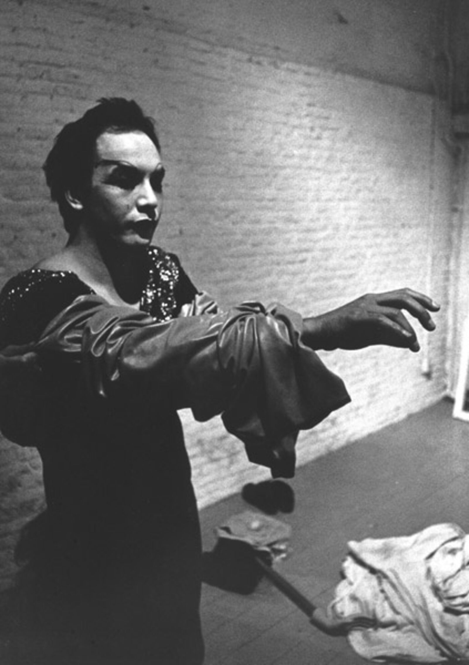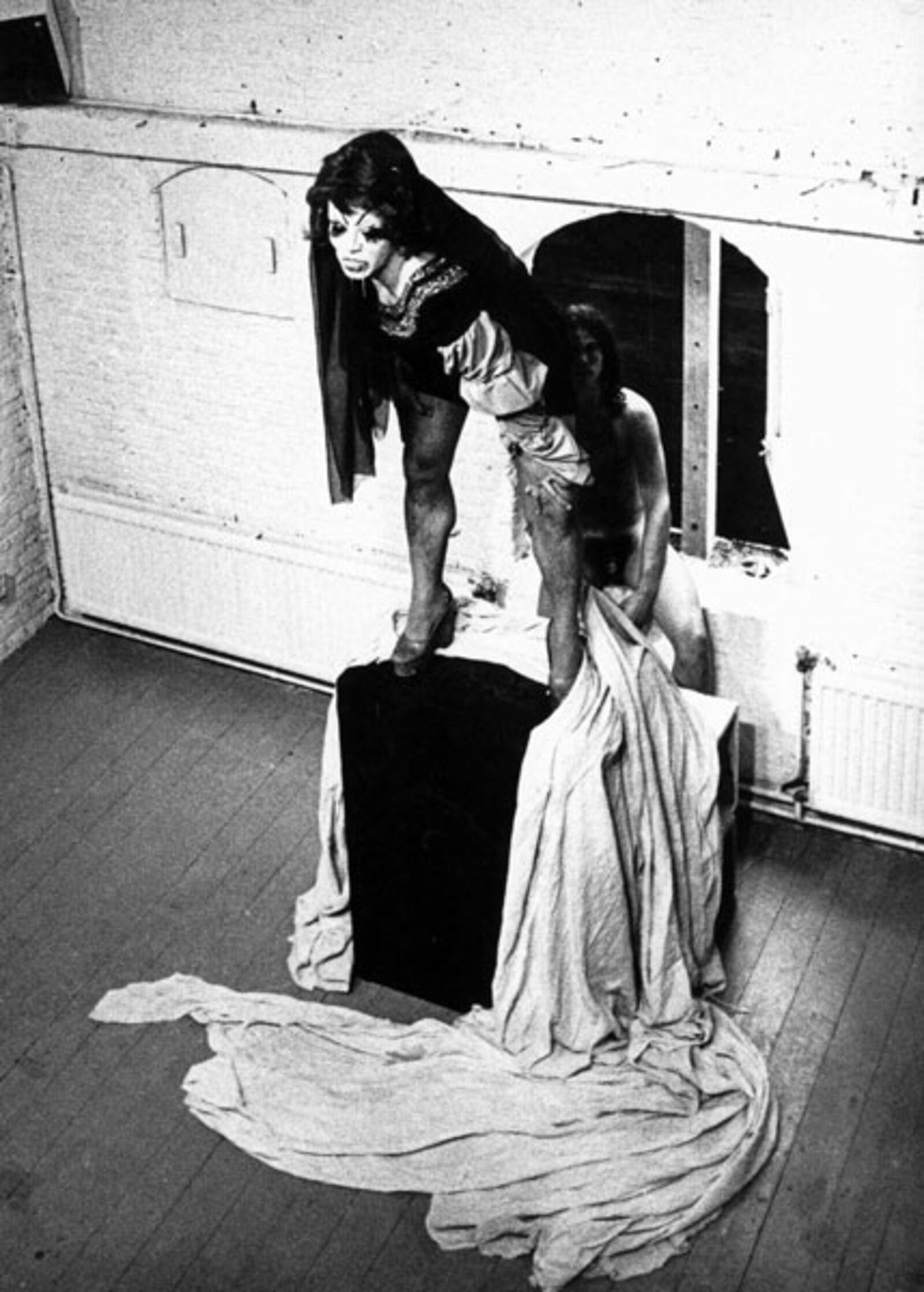 'Het uitgangspunt van mijn performance is een kitschvoorwerp: een Maria in een stolp met sneeuw. Tijdens de performance manifesteer ik het voorwerp in en door mijzelf. Ik sta met mijn rug naar het publiek en suggereer door middel van een masker dat ik het publiek aankijk. Door mij om te draaien verander ik steeds: van hoer in maagd, van vrouw in man, van licht in donker, van stilstand in beweging en van koud in warm.'