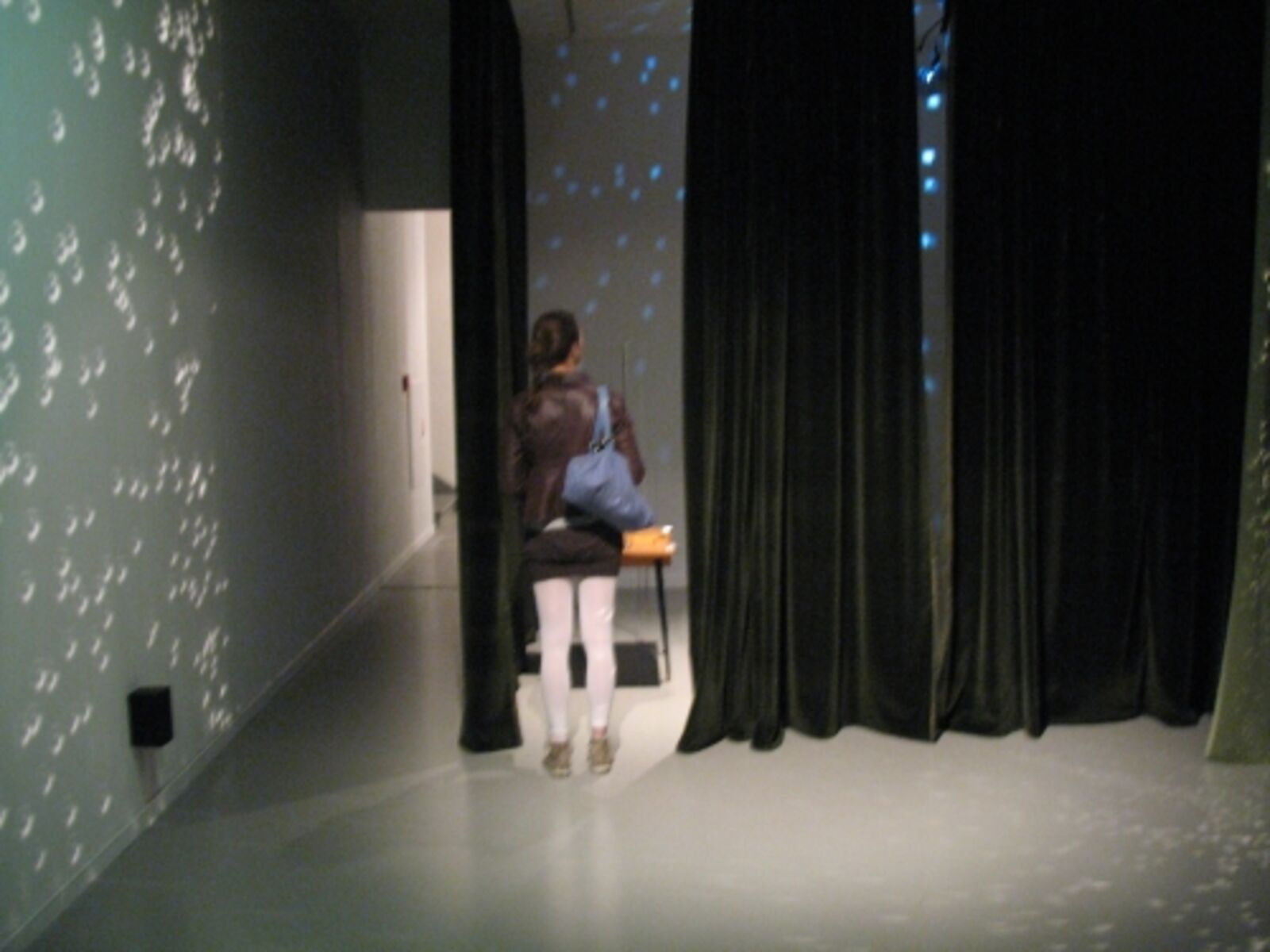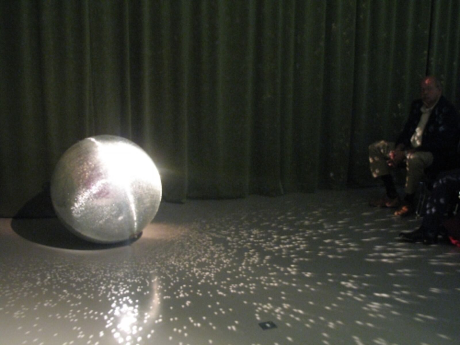 Suchan Kinoshita, "Omweg voor publiek, twee discoballen, twee doeken, rear windows, fysiotherapeut, psychiater en een kaptafel", 2008, installatie.