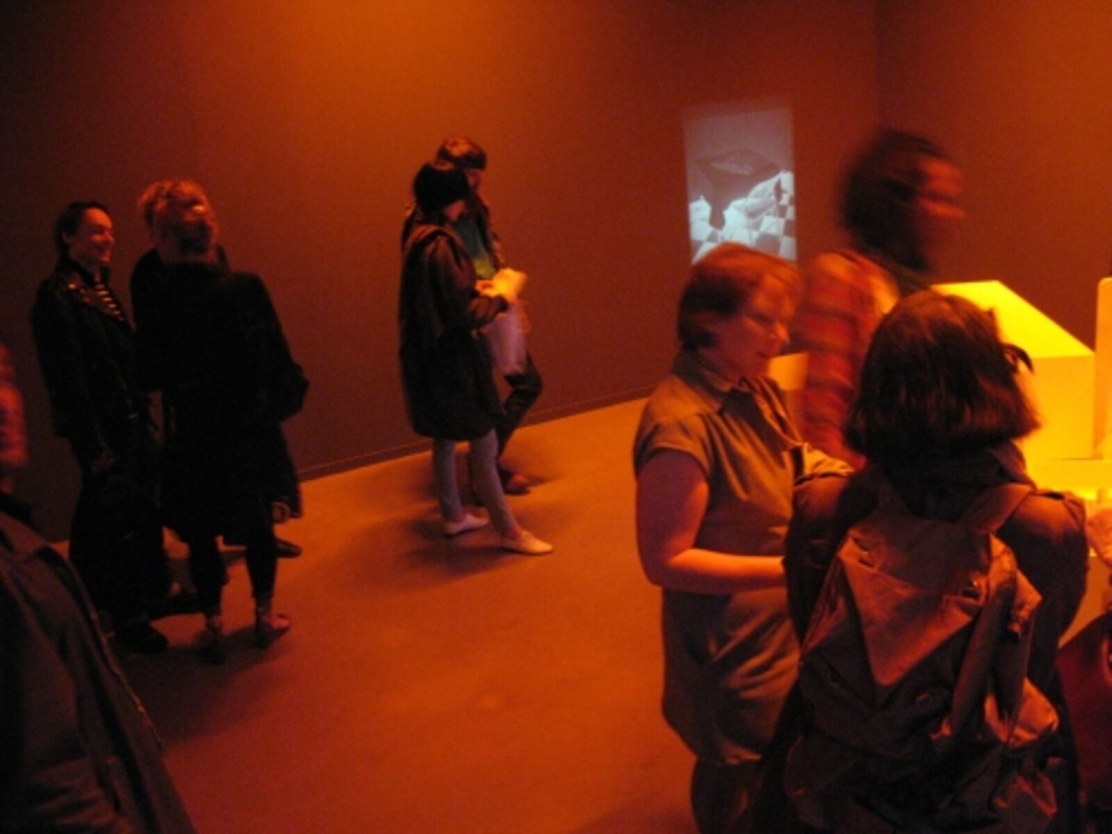 Sarah Pierce, "It's time man. It feels imminent", 2008, installatie met video, audio, diaprojectie, kleurenfolie, presentatiemeubels en diverse stukken uit het archief van de Appel.