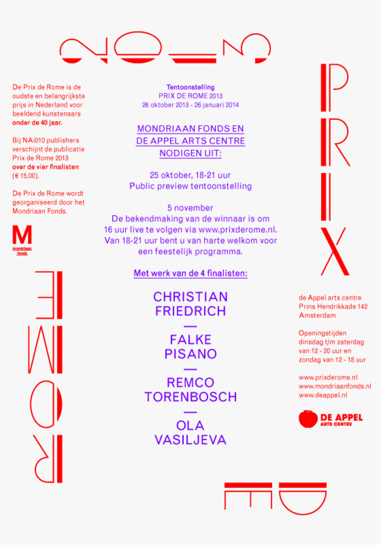 Op 25 oktober om 18.00 uur is de public preview van de Prix de Rome tentoonstelling in de Appel arts centre. Christian Friedrich, Falke Pisano, Remco Torenbosch en Ola Vasiljeva zijn de afgelopen vijf maanden in de gelegenheid gesteld om nieuw werk te maken waarop zij door de internationale jury beoordeeld zullen worden.