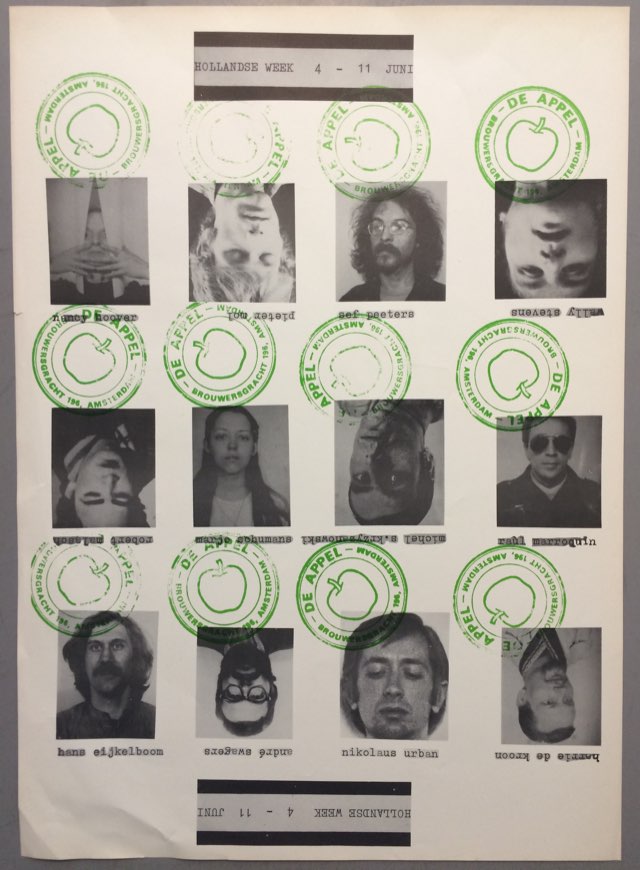 Gedurende een week zullen twaalf Nederlandse (of in Nederland wonende) kunstenaars in de Appel optreden: Michel Szulc Krzyzanowsk, Hans Eijkelboom, Marjo Schuman, Sef Peeters, Harrie de Kroon, Pieter Laurens Mol, Wally Stevens, Nikolaus Urban, Raùl Marroquin, André Swagers, Nan Hoover en Robert Malasch, Alle twaalf kunstenaars leggen hun ideeen vast in teksten, foto's en films. Ook hun optreden in 'De Appel' zal op video worden vastgelegd. Hun vormgeving kenmerkt zich verder door het feit, dat zij de grenzen van de galerieruimte en van de vastgestelde tijd (een week) kan overschrijden. Akties of gedeelten daarvan vinden buiten de galerie plaats of zijn al voor de opening van de week begonnen. (gedeelte van de tekst op het informatieblad door Liesbeth Brandt Corstius)