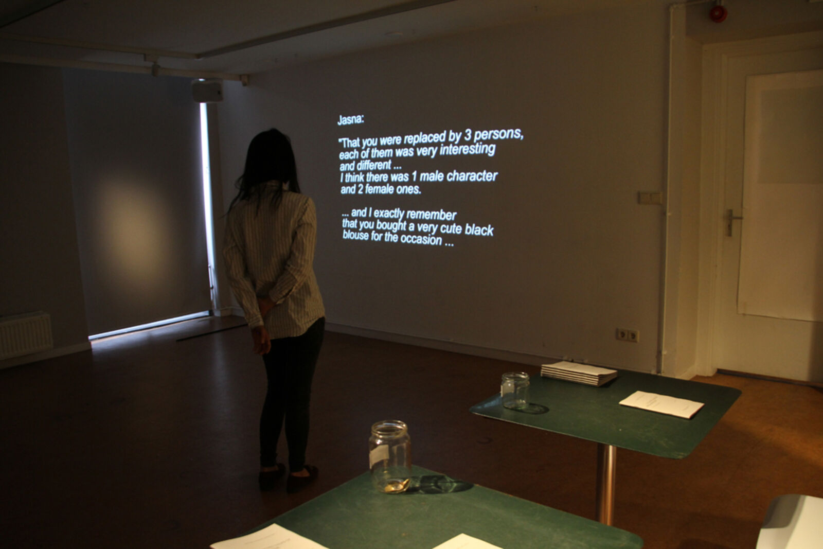 In een poging de performance die ze jaren geleden uitvoerde te herbeleven en de herinneringen die nog steeds bestaan bij het publiek te omvatten toont de Appel arts centre documentatie van de performance in Slovenia in het souterrain tot 10 mei.