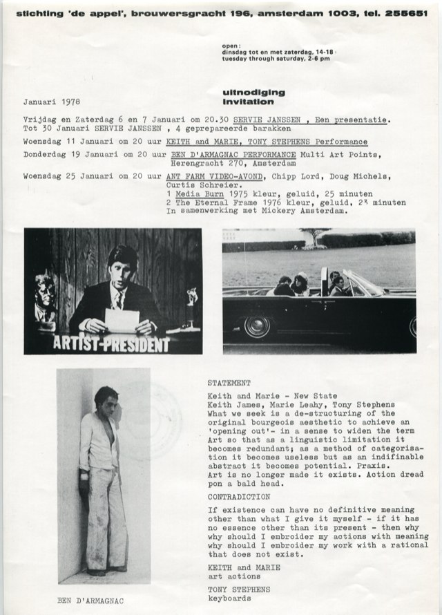 Op de vloer ligt een vierkante lap wit plastic. Op één van de muren is een vlak verzacht door een gecapitonneerde laag. In de ruimte klinkt het klaaglijk loeien van een koe. Ben d'Armagnac ligt in een grijs pak op het witte plastic. Hij beweegt zijn armen en benen. Na enige tijd kruipt hij naar de gecapitonneerde plek op de muur en bonst er met zijn hoofd tegenaan. Op dat moment klinkt uit een tweede luidspreker ook het klaaglijk loeien van een koe en het geluid van ijzeren voorwerpen die tegen elkaar stoten. Ben d'Armagnac maakt, terwijl hij met zijn hoofd tegen de gecapitonneerde plek bonkt, een indringend klagend geluid. Als hij ophoudt met bonken en teruggaat naar het plastic, houdt ook het geluid van de tweede luidspreker op. De beschreven handelingen worden voor de duur van de performance herhaald. De geluidsopnamen zijn gemaakt in een slachthuis en men hoort het loeien van de koeien die geslacht worden en die vervolgens aan haken over rails geschoven worden.