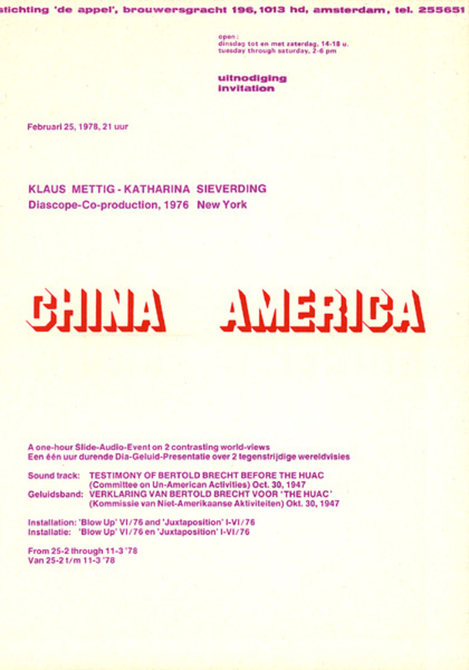 'Een één uur durende dia-geluid-presentatie over twee tegenstrijdige wereldvisies. Geluidsband: verklaring van Bertold Brecht voor de HUAC (Commissie van niet-Amerikaanse Activiteiten) op 30 oktober 1947. Dia-installatie: Blow Up VI/76 en Juxtaposition I-VI/76.' (Uitnodiging De Appel, februari 1978.)