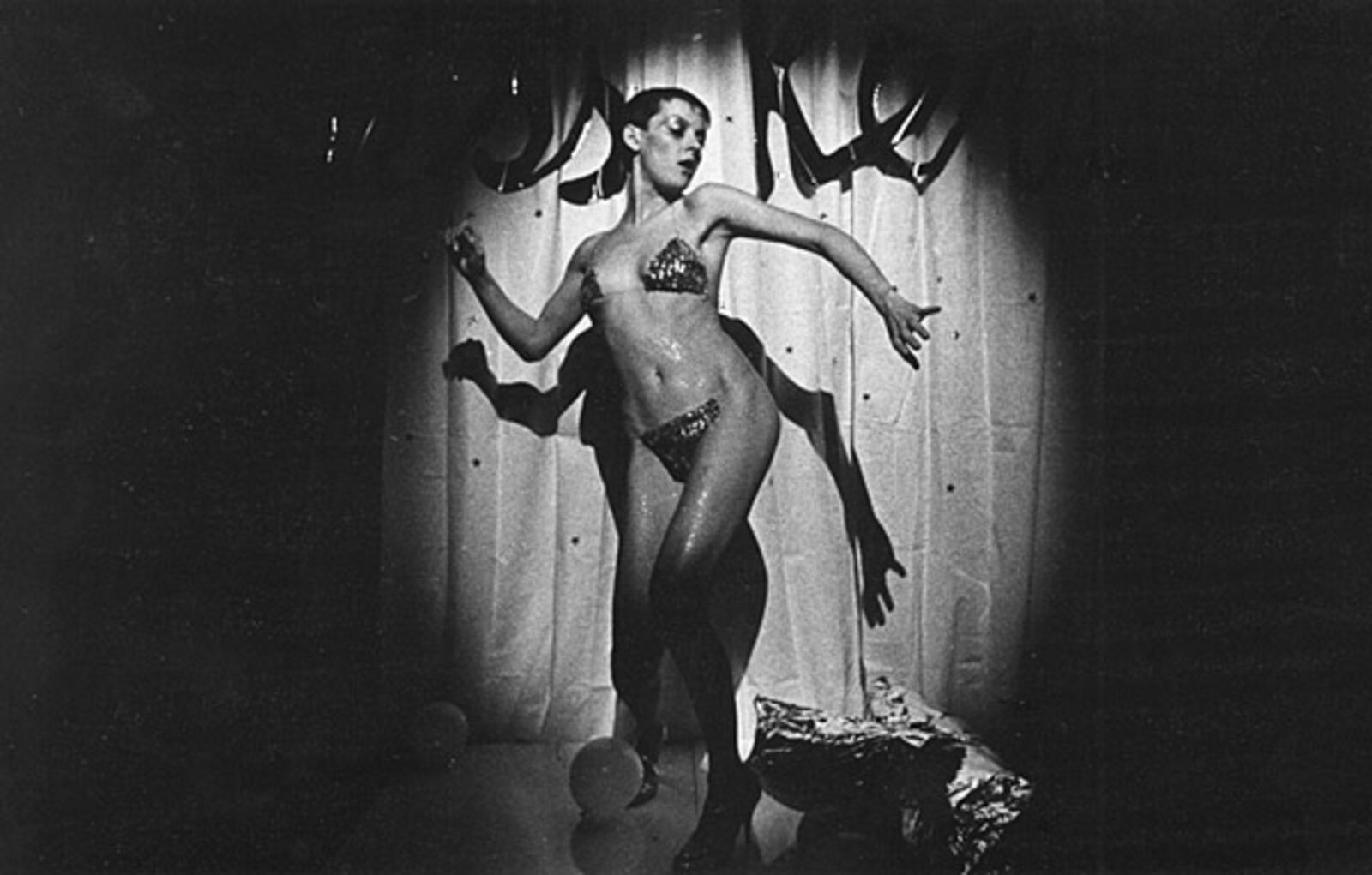 Invitation for several evenings with presentations by different artist, with special mention of the lecture by Harald Szeemann and picture of performance by Marja Samsom. Pink stamp of Michael Cardena on the invitation.