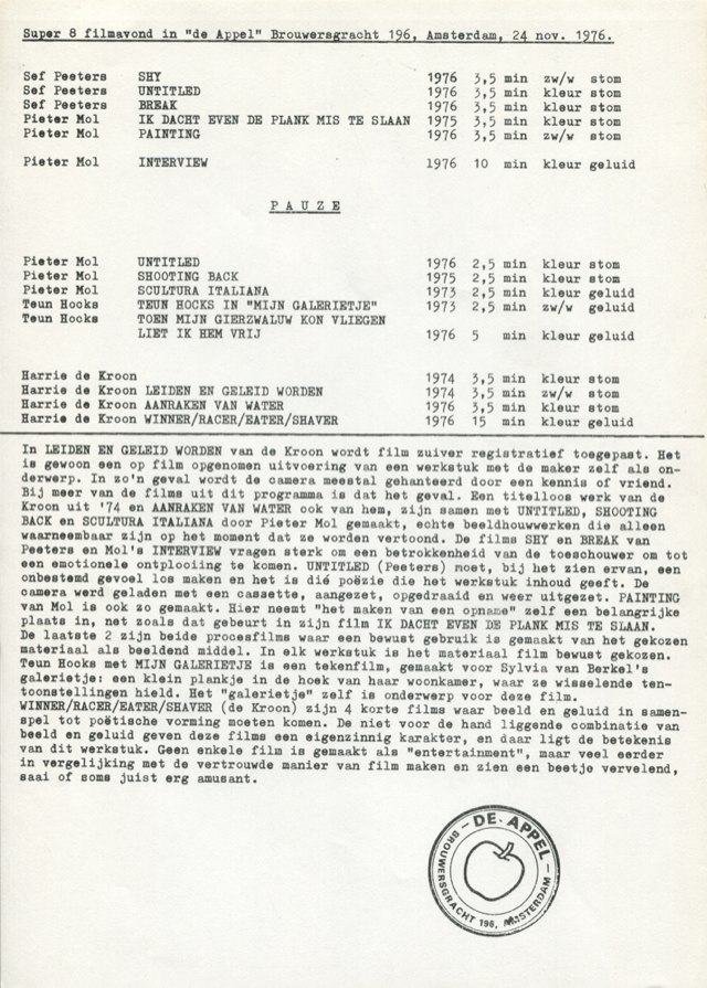 Announcement and invitation sheet of filmpresentation : Super 8 filmavond with Sef Peeters Pieter Mol Teun Hocks Harrie de Kroon